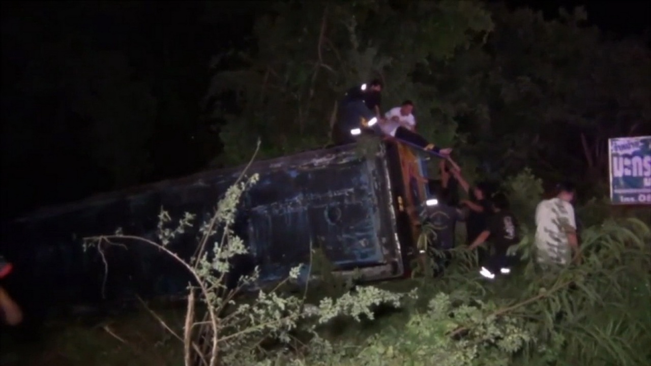 รถบัสรับคนงานจากบางปะอิน มุ่งหน้าสิงห์บุรี หักหลบกระบะตัดหน้า เสียหลักพลิกคว่ำริมถนนสายเอเชีย พื้นที่อ่างทอง เจ็บระนาว 17 ราย สาหัส 1...