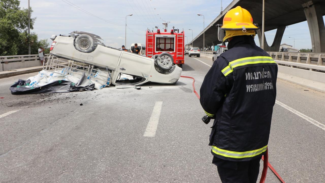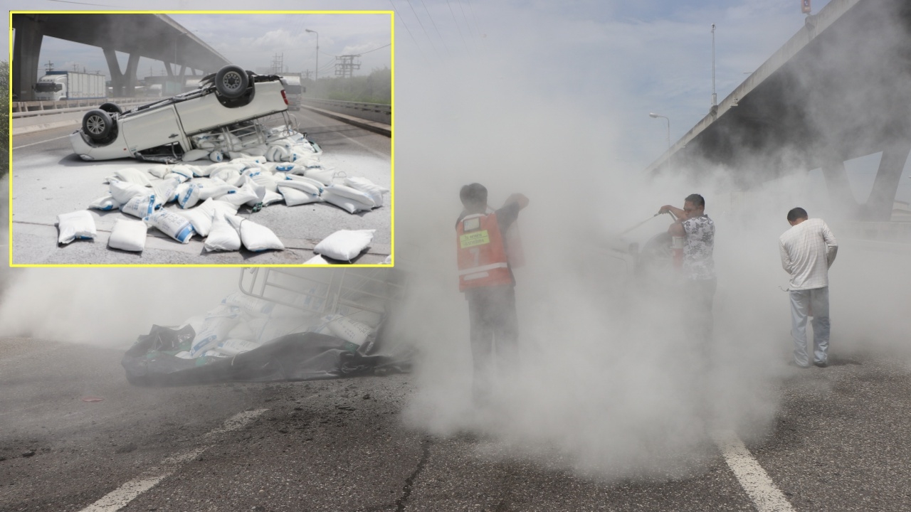 รถกระบะบรรทุกเกลือ วิ่งข้ามสะพานแม่น้ำบางปะกง ยางล้อหลังระเบิดพลิกหงายท้อง เกิดไฟลุกบริเวณถังแก๊สแอลพีจี ทำให้กู้ภัยต้องเร่งใช้ถังดับเพลิงฉีดสารเคมีดับ ส่วนคนขับรีบคลานหนีออกมา...