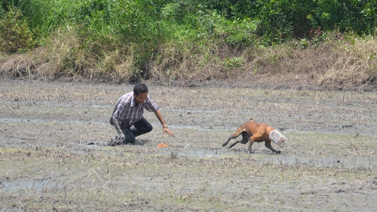 เจ้าหน้าที่กู้ภัยฯและชาวบ้าน อ.บ้านนา จ.นครนายก ช่วยกันไล่จับหมาแม่ลูกอ่อนพันธ์ุไทย หัวติดอยู่ในขวดโหลพลาสติกใสตามองเห็น ไม่ได้กินอะไร มาตั้งแต่เมื่อวาน ชาวบ้านสงสารร้องให้ช่วย กว่าจะสำเร็จต้องไล่จับในทุ่งนา จมโคลนทุลักทุเล