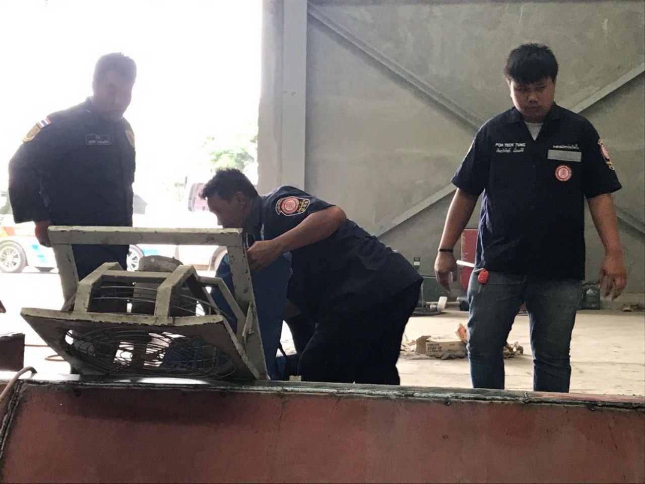 ในที่เกิดเหตุ พบผู้ได้รับบาดเจ็บเป็นชาย 1 ราย สวมเสื้อยืดแขนยาว นุ่งกางเกงขายาว นอนหงายขยับตัวไปมาได้อยู่ที่ก้นบ่อเก็บข้าว ที่กำลังสร้างใหม่ สูงกว่า 10 เมตร มีอาการปวดแขนด้านขวา และปวดหลังอาการสาหัส ทราบชื่อต่อมาคือ นายถวัลย์ สุขเกษม อายุ 51 ปี ช่างเชื่อมเหล็ก อยู่บ้านเลขที่ 12/1 หมู่ที่ 2 ตำบลหัวไผ่ อำเภอเมือง จังหวัดอ่างทอง ทางเจ้าหน้าที่กู้ภัยจึงต้องลงไปช่วยเหลือในบ่อเก็บข้าว โดยมุดเข้าไปในช่องเล็กๆ ขนาดพอคนลอดด้วยความยากลำบาก จากนั้นได้ช่วยเหลือทำการปฐมพยาบาลเบื้องต้น ก่อนที่จะนำใส่กระดานรองหลัง เนื่องจากผู้ได้รับบาดเจ็บมีอาการปวดหลังมาก เพราะว่าก้นกระแทกพื้นอย่างแรง และทำการมัดด้วยเชือกจนแน่นให้ผู้ได้รับบาดเจ็บติดอยู่กับกระดาน แล้วช่วยกันดึงขึ้นมาอย่างระมัดระวังเพราะว่ากลัวเชือกจะขาด จนนำขึ้นมาได้อย่างปลอดภัย และนำส่งโรงพยาบาลอ่างทอง