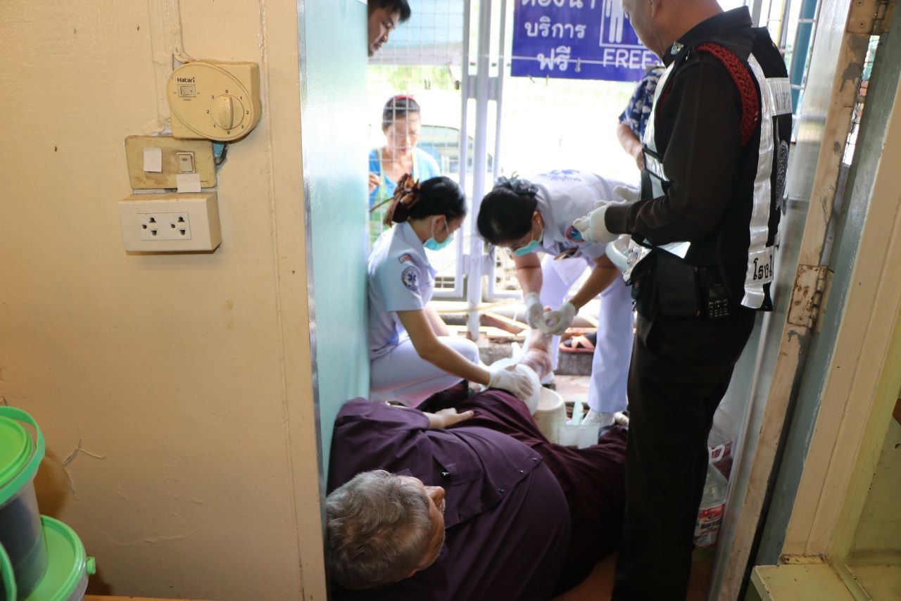 ที่เกิดเหตุ พบ นายเจมส์ (นามสมมติ) อายุ 50 ปี สัญชาติอเมริกัน นั่งอยู่บริเวณหน้าทางเข้าห้องน้ำของร้านด้านหลัง ได้รับบาดเจ็บ มีบาดแผลขนาดใหญ่ที่หน้าแข้งซ้าย ทำให้เสียเลือดมาก อีกทั้ง นายเจมส์ น้ำหนักเกือบ 200 กิโลฯ ทำให้ช่วยเหลือลำบาก ระหว่างที่ทีมกู้ชีพปฐมพยาบาลเบื้องต้น เพื่อห้ามเลือด นายเจมส์ พยายามที่จะลุกขึ้นมาเดินเอง แต่ขณะที่กำลังจะยืน เกิดหมดสติล้มลง ทำให้ทางเจ้าหน้าที่ต้องช่วยกันพยุงร่าง ให้นอนบนเปล โดยใช้คนประมาณ 10 คน ในการยกเปลขึ้นรถพยาบาล เพื่อนำส่งโรงพยาบาลจุฬารัตน์ 11