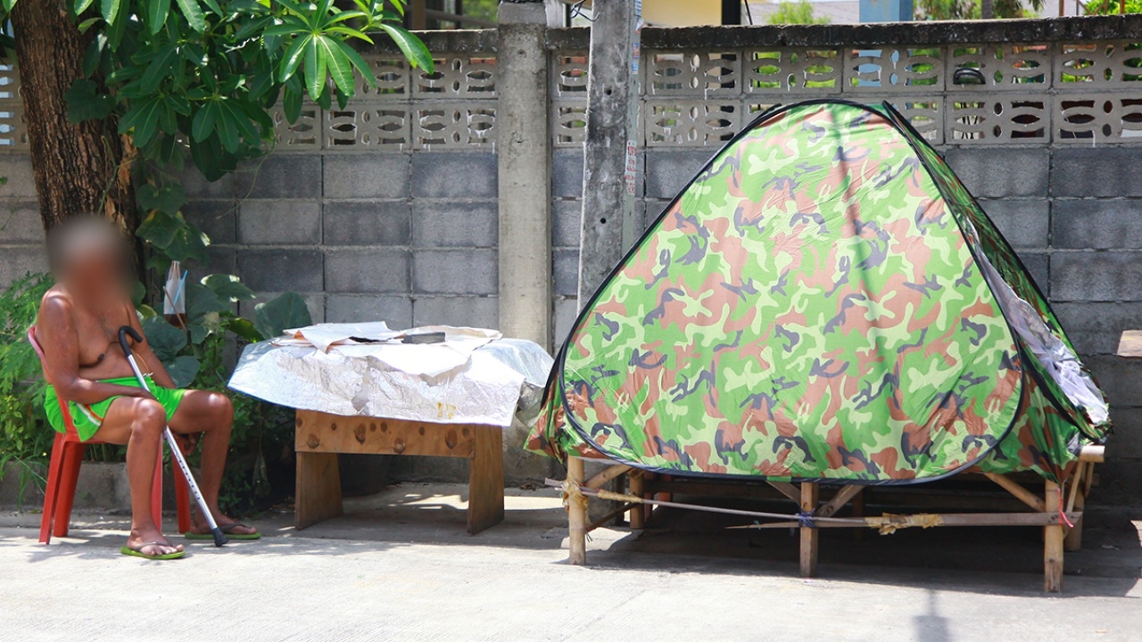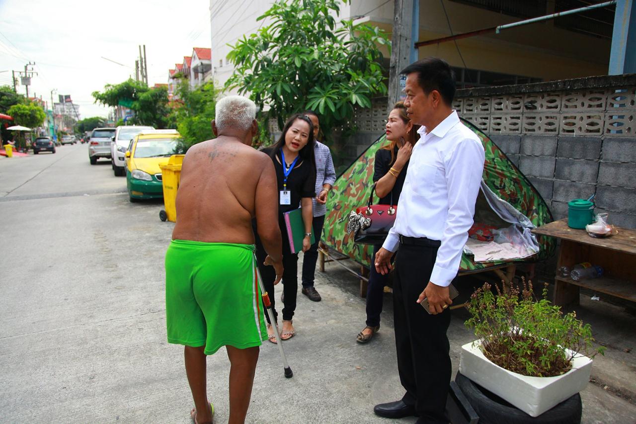 เมื่อไปถึงได้พบชายชราคนดังกล่าว สวมกางเกงขาสั้นตัวเดียว ไม่สวมเสื้อสภาพร่างกายขาอ่อนแรง กำลังถือไม้เท้าเดินออกมาจากเต็นท์นอน ซึ่งตั้งอยู่ริมถนนในหมู่บ้าน สร้างความเวทนาให้กับชาวบ้านที่ผ่านไปมาอย่างมาก สอบถาม ทราบว่าชื่อนายน้อย (ขอสงวนนามสกุล) อายุ 62 ปี มีชื่ออยู่ในซอยเคหะคลองเตย 4 แขวงและเขต คลองเตย กรุงเทพฯ