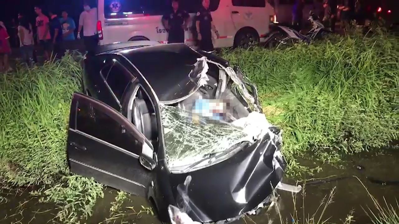 หนุ่มขับเก๋ง แซงไม่พ้น หักหลบเฉี่ยวท้าย 10 ล้อ ก่อนรถเสียหลักตีลังกาหลายตลบ ไถลตกคูน้ำข้างทาง ทำเพื่อนนั่งมาด้วยเสียชีวิตคาที่ ส่วนตัวเองรอดตายปาฏิหาริย์