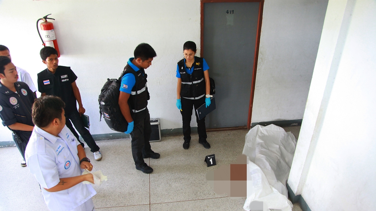 ทั้งนี้ ที่เกิดเหตุเป็นตึก 5 ชั้น พบศพนายอ๋อง เยส สอ๋อง อายุ 40 ปี สัญชาติพม่า นอนเสียชีวิตที่ชั้น 4 ใกล้ทางขึ้นบันได ชันสูตรพลิกศพเบื้องต้น พบบาดแผลถูกแทงด้วยของมีคมเข้าที่บริเวณหน้าอกซ้าย 2 แผล และกลางหลังอีก 8 แผล จากนั้นเจ้าหน้าที่ได้เข้าตรวจสอบภายในห้องพักในห้องมีร่องรอยการต่อสู้ และมีหยดเลือดตกอยู่ และพบปลอกเหล็กขูดชาร์ปตกอยู่ 1 อัน จึงเก็บไว้เป็นหลักฐาน
