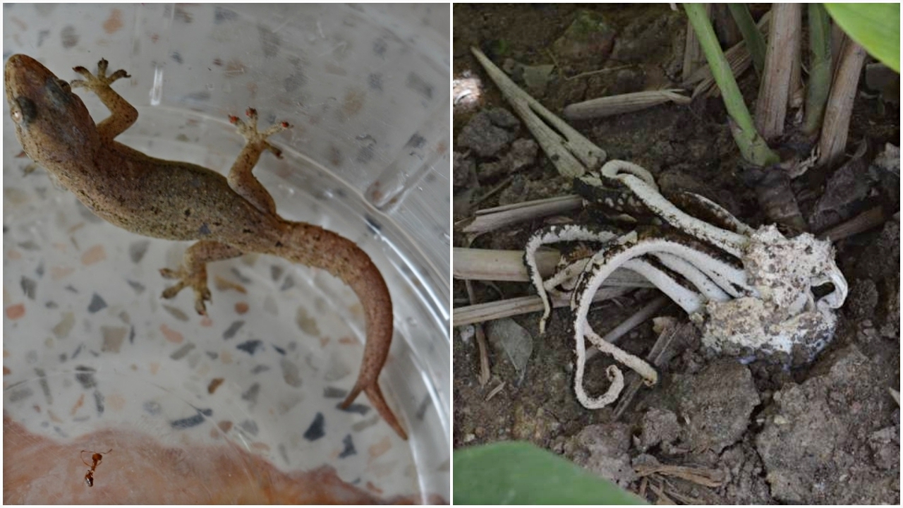 "จิ้งจก 2 หาง มีความยาวประมาณ 3 นิ้วเศษ ซึ่งเลี้ยงอยู่ในโหลแก้ว โดยจับยุงและมดมาเป็นอาหาร"