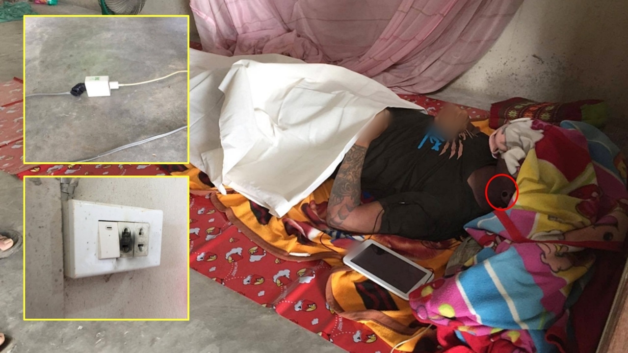 หนุ่มลาวมาหางานที่จันทบุรี นอนใส่หูฟังที่เสียบจากแท็บเล็ต พร้อมดัดแปลงที่ชาร์จ นำสายไฟมาพันกับขาเสียบ เพื่อจะต่อให้ถึงปลั๊กที่อยู่บนผนัง จนเกิดลัดวงจร ไฟช็อตตายตัวแข็งทื่อคาที่นอน...