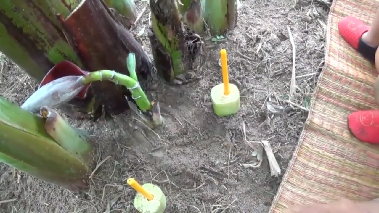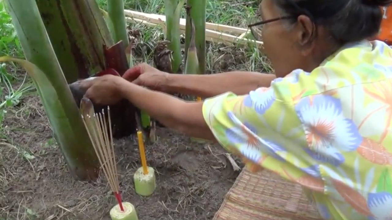 ชาวบ้านแห่ปูเสื่อ จุดธูปขอเลขเด็ดต้นกล้วยน้ำว้าประหลาดในสวนแห่งหนึ่งที่ จ.ชลบุรี มีหัวปลีทั้งด้านบนและด้านล่าง