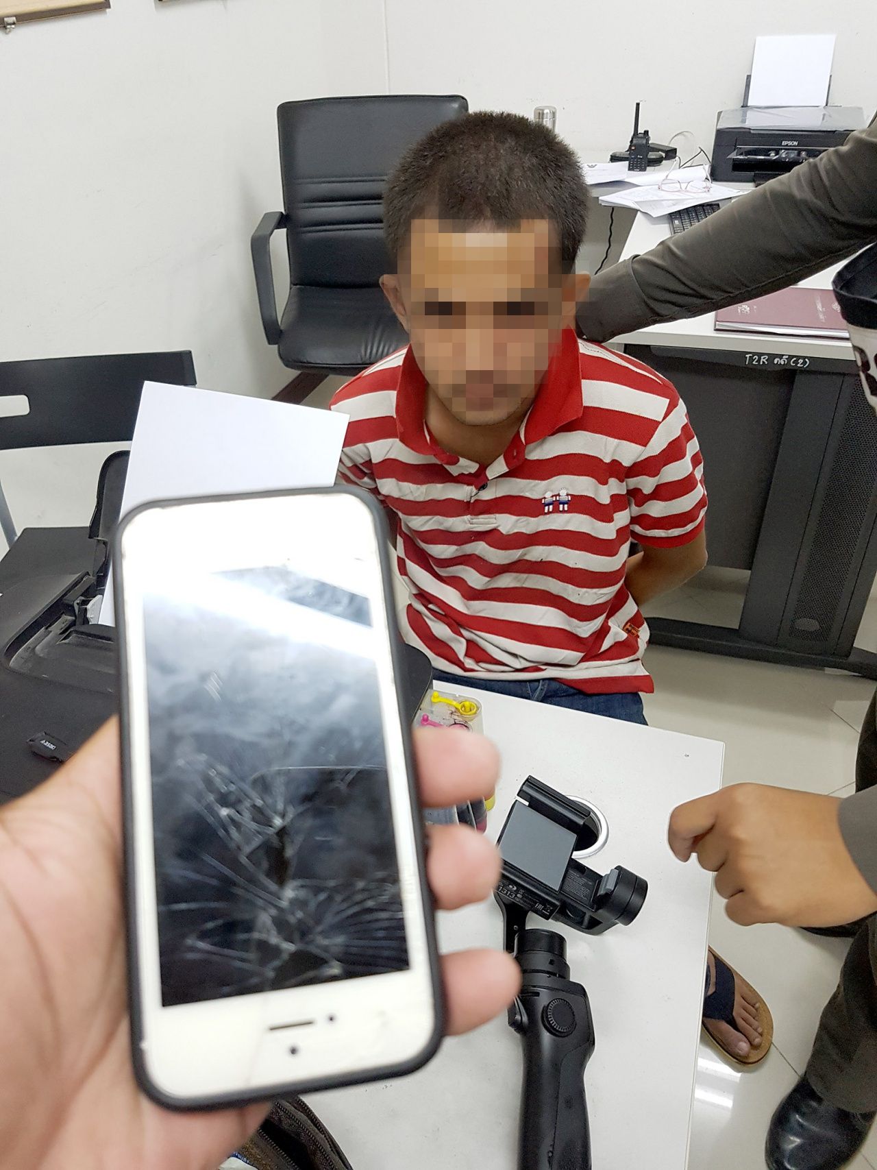 ที่เกิดเหตุหน้าห้องน้ำหญิงพบกลุ่มพลเมืองดี และผู้เสียหาย เป็นหญิงสาว อายุ 25 ปี ที่อยู่ในอาการตกใจ กำลังรุมล้อมจับตัวผู้ก่อเหตุทราบชื่อภายหลัง คือ นายณัฐวัฒน์ อยู่มั่น อายุ 21 ปี พักอยู่ในพื้นที่ ม.7 ต.พลูตาหลวง อ.สัตหีบ สภาพหน้าตาปูดบวมจากการถูกรุมประชาทัณฑ์ พร้อมของกลางโทรศัพท์มือถือ ไอโฟน 5 สีขาว 1 เครื่อง ขาตั้งสำหรับต่อยื่นออกไป 1 อัน ใช้ในการบันทึกภาพแอบถ่าย และจักรยานยนต์ ฮอนด้า เวฟ สีน้ำเงิน-ขาว ทะเบียน 1กฆ-2873 ระยอง ที่ใช้เป็นยานพาหนะ จากนั้นเจ้าหน้าที่ตำรวจสายตรวจได้ควบคุมตัวพร้อมของกลาง นำส่งพนักงานสอบสวน