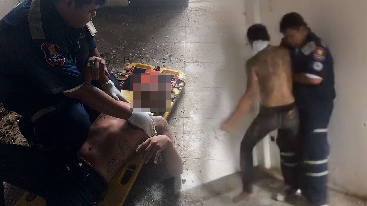 ที่เกิดเหตุภายในร้านพบ นายนพดล (สงวนนามสกุล) อายุ 24 ปี ชาว อ.พนัสนิคม จ.ชลบุรี อยู่ในสภาพคลุ้มคลั่ง กำลังพยายามทำร้ายตัวเอง ด้วยการใช้ปลายแหลมที่แคะเล็บของกรรไกรตัดเล็บ ทิ่มบริเวณใต้ราวนมซ้าย จนเป็นบาดแผลเลือดไหล โดยเจ้าหน้าที่ตำรวจและหน่วยกู้ภัย ได้ช่วยกันจับตัว เพื่อให้สติอารมณ์ ก่อนทำการปฐมพยาบาล