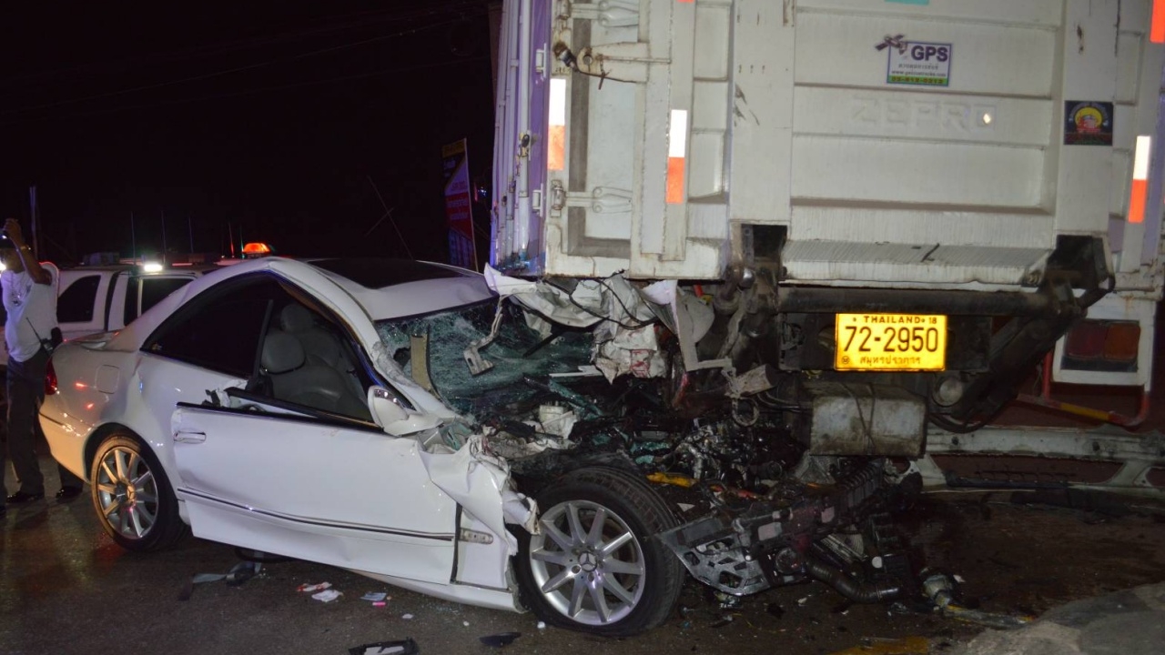 ลูกชายเจ้าของบริษัทผลิตสุขภัณฑ์ห้องน้ำ – ห้องครัว ชาวไต้หวัน ควบเบนซ์สปอร์ตชนรถบรรทุก 6 ล้อ เลี้ยวยูเทิร์นตัดหน้า ถูกอัดติดคอนโซล เจ็บสาหัส บนถนนศุขประยูร ขาเข้า จ.ชลบุรี