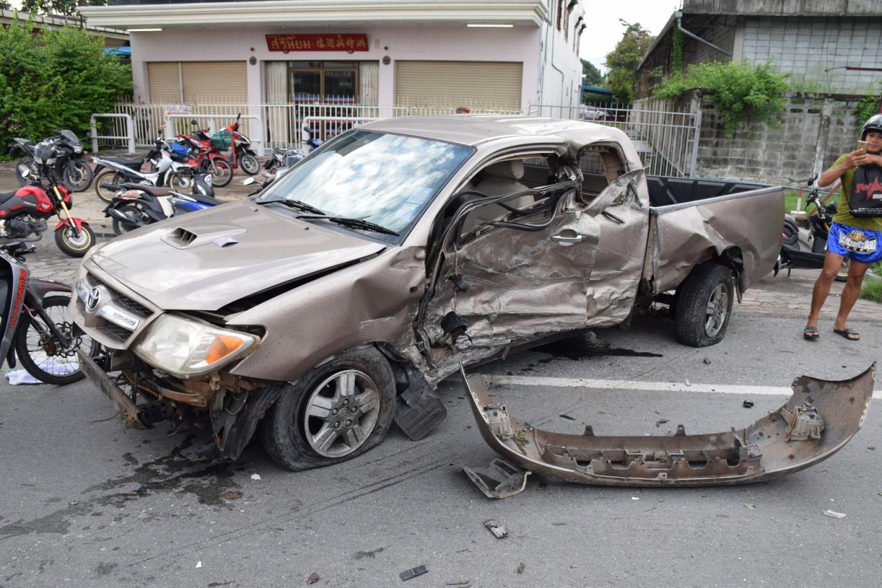 ห่างจากรถตู้ไปประมาณ 10 เมตร พบรถกระบะยี่ห้อโตโยต้า วีโก้ สีบรอนซ์ทอง ทะเบียน ผอ 8896 นครราชสีมา จอดในสภาพหน้ารถและประตูด้านซ้ายถูกชนยับเป็นแถบ มี นางหนูรักษ์ รดากร อายุ 50 ปี คนขับ ได้รับบาดเจ็บ แน่นหน้าอก หลังปฐมพยาบาล เจ้าหน้าที่กู้ภัยเร่งนำผู้บาดเจ็บทั้งหมดส่ง รพ.ชลบุรี