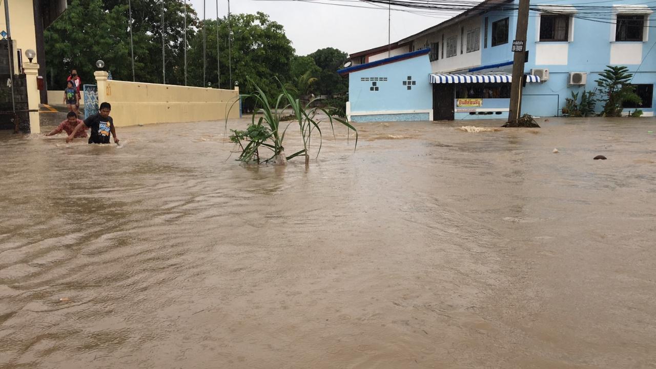 ส่วนด้านชุมชน ตลาดฉลอง หมู่ 2 ต.สุรศักดิ์ อ.ศรีราชา นายนิติ วิวัฒน์ นายอำเภอศรีราชา พร้อมเจ้าหน้าที่ รีบรุดเข้าตรวจสอบและช่วยเหลือชาวบ้านซึ่งถูกน้ำที่ไหลลงมาจากภูเขามาตามคลองและท่อซึ่งระบายไม่ทันได้เอ่อล้นเข้าท่วมบ้านเรือนประชาชนซึ่งมีความแรงของน้ำและสูงกว่า 60 เซนติเมตร ประชาชนต้องยกสิ่งของขึ้นสู่ที่สูง โดยได้นำกระสอบทรายมาเข้าช่วยเหลือประชาชนที่ถูกน้ำล้นเข้าบ้านในเบื้องต้น ในขณะที่บริเวณแยกไฟแดงอัสสัมชัญศรีราชา น้ำที่ไหลทะลักเอ่อล้นขึ้นมาได้ไหลลงมาท่วมถนนบริเวณแยกอัสสัมชัญสูงกว่า 30 ซม. ทำให้เกิดการจราจรติดขัดยาว เจ้าหน้าที่ตำรวจจราจรศรีราชาต้องเร่งระบายรถที่สัญจรผ่านและบอกเส้นทางให้กับประชาชนที่ต้องใช้เส้นทางดังกล่าวเพื่อความสะดวกและปลอดภัย โดยมีเจ้าหน้าที่ตำรวจศรีราชา เจ้าหน้าที่ทหาร เจ้าหน้าที่เทศบาลเมืองศรีราชา และเจ้าหน้าที่เทศบาลนครเจ้าพระยาสุรศักดิ์ ได้ช่วยกันอำนวยความสะดวกและช่วยเหลือ ประชาชน ด้วยการเก็บกวาดขยะที่กองปิดปากท่อระบายน้ำ อำนวยความสะดวกเรื่องการจราจร ให้รถที่วิ่งอยู่บนถนนสุขุมวิทเปลี่ยนเส้นทางไปใช้ถนนสายเลี่ยงเมือง บายพาส สาย 7 เพื่อมุ่งหน้าเข้าสู่พัทยาแทนเส้นทางถนนสุขุมวิท