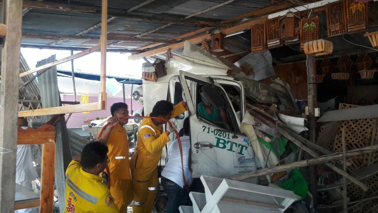 เมื่อไปถึง พบเจ้าหน้าที่กำลังใช้เครื่องตัดถ่าง ช่วยเหลือคนขับรถ ทราบชื่อคือ นายลิขิต สุวรรณทะโร อายุ 61 ปี ออกจากบริเวณหน้ารถ 18 ล้อพ่วง ยี่ห้ออีซูซุ หมายเลขทะเบียนส่วนหัว 71-0201 ชลบุรี ส่วนพ่วง 71-0213 ชลบุรี ซึ่งรถคันดังกล่าวพุ่งทะลุกลางบ้าน มาจอดอยู่กลางบ้านหลังที่ 3 ซึ่งเป็นร้านค้าของชำของ นางกนกรัตน์ ชัยศรี อายุ 44 ปี โดยหลังแรกเป็นร้านขายก๋วยเตี๋ยวของ นางสาวฐาปนีย์ โชติพานิชวัฒนกุล อายุ 32 ปี ส่วนร้านที่สอง เป็นร้านซักอบรีดของ นางกาญจนา พรมยินดี อายุ 45 ปี ซึ่งทุกร้าน ได้รับความเสียหาย เป็นทรัพย์สินภายในบ้านหลายอย่าง แต่ไม่มีใครได้รับบาดเจ็บหรือเสียชีวิต