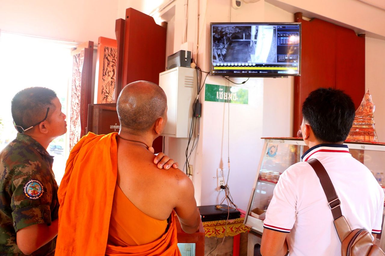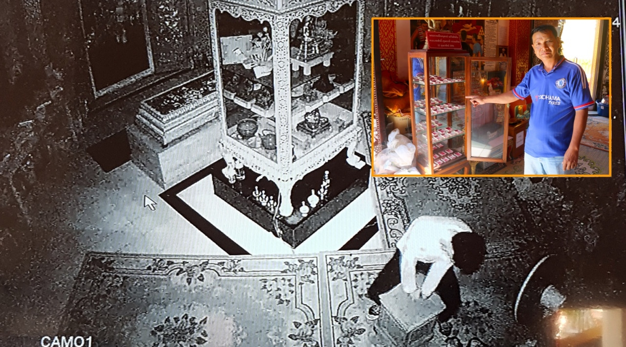 ด้าน พ.ต.อ.ชโลธร เปรมปรี ผกก.สภ.สัตหีบ เปิดเผยว่า หลังเกิดเหตุได้ตรวจสอบจากภาพกล้องวงจรปิดของวัด ซึ่งบันทึกพฤติกรรมของคนร้ายอย่างชัดเจน ในช่วงเวลา 00.18 – 00.24 น. ของวันที่ 6 ธ.ค. คนร้ายรายนี้เป็นชาย อายุระหว่าง 25-30 ปี สูงประมาณ 170 ซม. ไว้ผมรองทรงต่ำ สวมเสื้อคอกลมแขนยาวสีขาว กางเกงขายาวสีดำ และสวมรองเท้าผ้าใบสีดำคาดขาว ลงมือก่อเหตุเพียงคนเดียวแบบใจเย็น ปีนเข้ามาจากกำแพงกรงเหล็กบริเวณทางขึ้นเจดีย์ นอกจากนี้ยังตรวจพบหลักฐานสำคัญคือ ก้นกรองบุหรี่ยี่ห้อ SMS แดง จำนวนมากถูกทิ้งไว้ในห้องน้ำหลังวิหาร และบนเจดีย์จุดเกิดเหตุ ซึ่งคาดว่าเป็นของคนร้ายสูบทิ้งไว้ ขณะเฝ้ารอเวลาลงมือโจรกรรม ล่าสุดได้มีการเก็บหลักฐานและรอยนิ้วมือคนร้ายไปตรวจ พร้อมสั่งการให้ชุดสืบสวนลงพื้นที่ออกติดตามจับกุมคนร้ายรายนี้มาดำเนินคดีให้ได้.