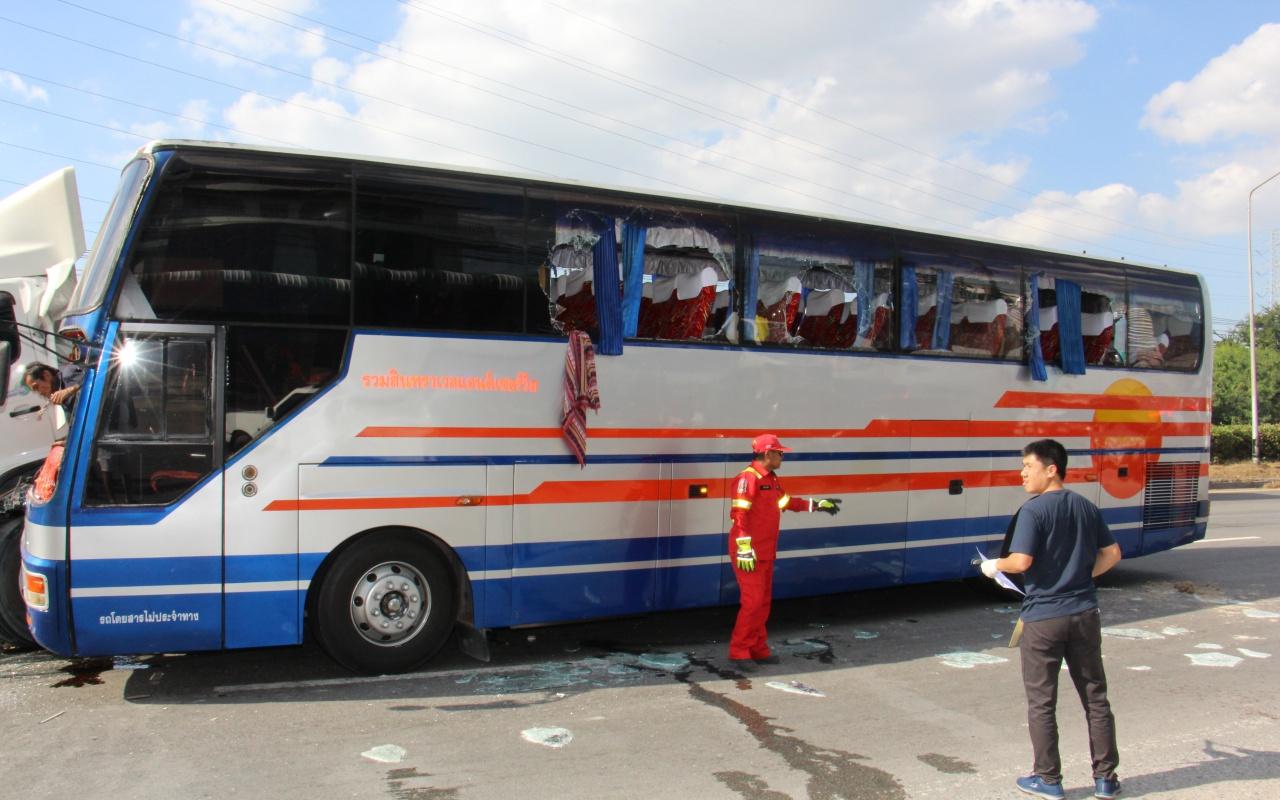 ด้านนายเสถียร กุลบุตรดี อายุ 51 ปี คนขับรถบัส เปิดเผยว่า รับนักท่องเที่ยวชาวจีน 28 คน ไกด์ 1 คน และหัวหน้าทัวร์ 2 คน รวมเป็น 21 คน ออกจากโรงแรมรอยัลซิตี้ ถนนบรมราชินี เขตตลิ่งชัน กรุงเทพมหานคร จะไปส่งที่เมืองพัทยา มาถึงที่เกิดเหตุถนนมี 4 เลน โดยรถของตนวิ่งอยู่เลนที่ 2 จากซ้าย ได้ถูกรถพ่วงบรรทุก 18 ล้อ ที่วิ่งอยู่ข้างหน้าเลนซ้ายสุดเบียดเข้ากินเลน จนเบียดชนรถกระบะและรถเก๋ง จากนั้นรถพ่วงได้ไถลมาเลนที่รถตนเองวิ่งตามหลังมา ถูกรถบรรทุกฟาดหน้ารถข้างขวาได้รับความเสียหาย