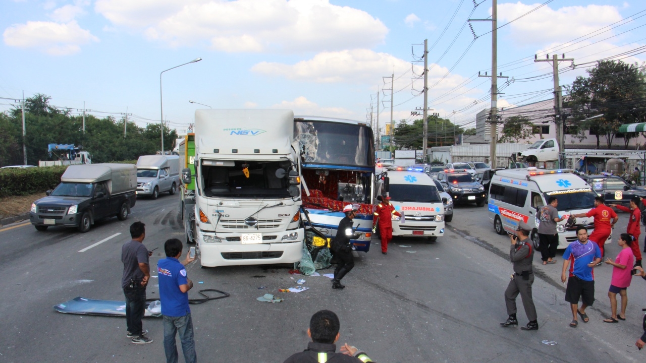 พ่วง 18 ล้อ ไถลเบียดกินเลนเฉี่ยวเก๋ง-กระบะ เป็นรอยครูดยาว บัสนักท่องเที่ยวจีนวิ่งตามหลัง เบรกไม่ทัน ฝั่งคนขับฟาดเข้าเต็มๆ ผู้โดยสารนั่งมากับรถแตกตื่น หวั่นแก๊สระเบิด ทุบกระจกหนีตาย เจ็บเล็กน้อย 31 คน...