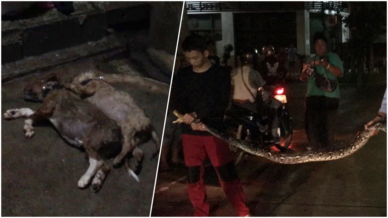 สองผัวเมียเมืองชล สุดเศร้า! พบงูเหลือมยักษ์ 5 เมตร กำลังเขมือบลูกสุนัขที่เลี้ยงไว้ 2 ตัว จึงรีบแจ้งเจ้าหน้าที่กู้ภัยฯ ช่วยจับ เจ้าของเผยเสียใจมาก เนื่องจากเพิ่งรับลูกสุนัขจากที่วัดมาเลี้ยง ไม่ถึง 1อาทิตย์ ดันมาถูกงูรัดจนดับคู่