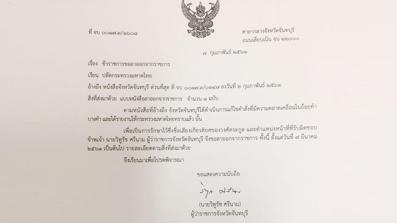 ผู้ว่าฯเมืองจันท์ ยื่นขอลาออกจากตำแหน่ง หลังมีคำสั่งคลาดเคลื่อนใช้ถ้อยคำผิด ในหนังสือต้อนรับนายกฯ-ครม.ลงพื้นที่ถกสัญจร เมื่อวันที่ 5-6 ก.พ.ที่ผ่านมา มีผล 7 มี.ค.นี้