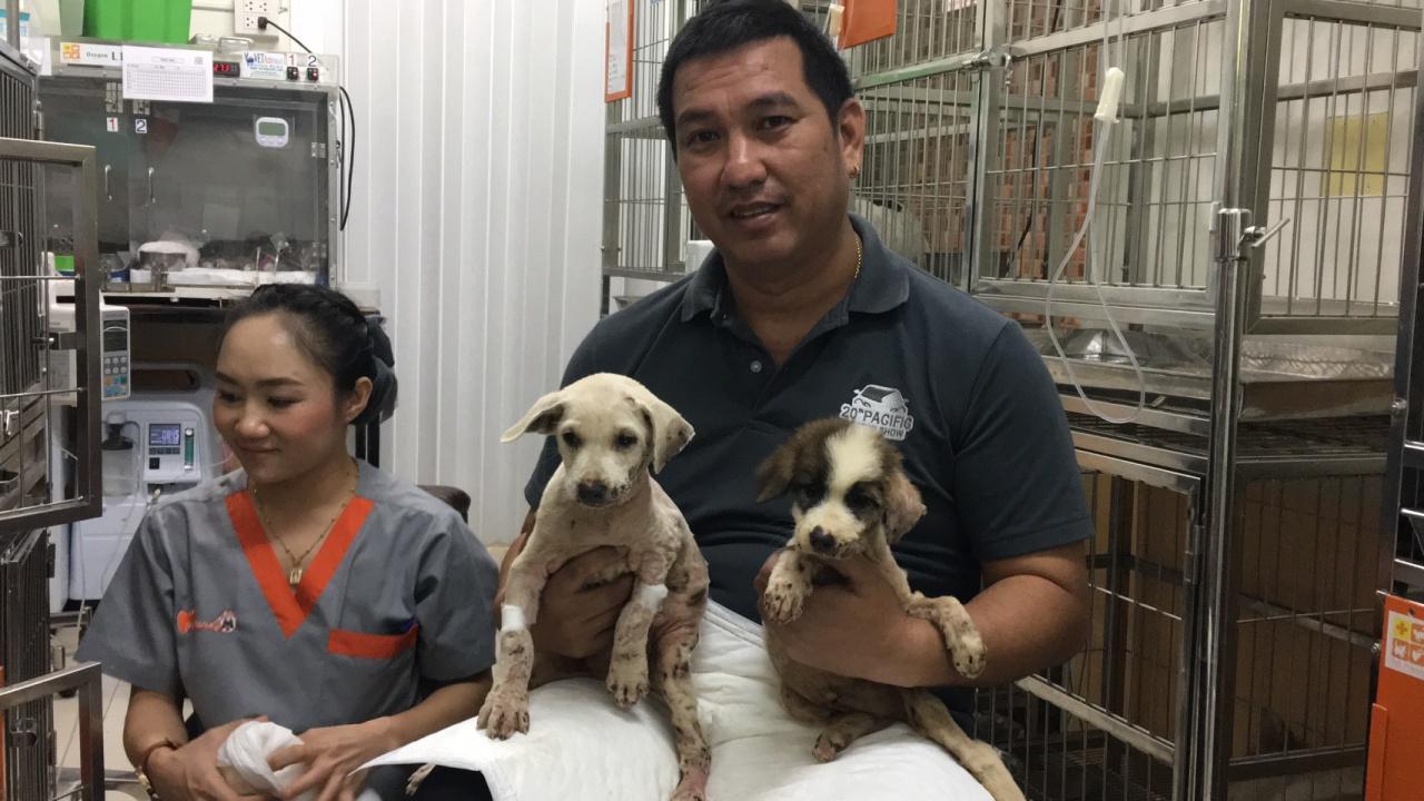 เปิดสภาพล่าสุด 'มะตอย-ตังเม' 2 สุนัขจรจัด คลุกยางมะตอยที่รั่วออกจากถัง ที่ศรีราชา สัตวแพทย์เผย ต้องระดมคนเกือบทั้งโรงพยาบาลช่วยล้างตัว ขณะที่อาการทั่วไปดีขึ้น ทั้งยังกินเก่ง