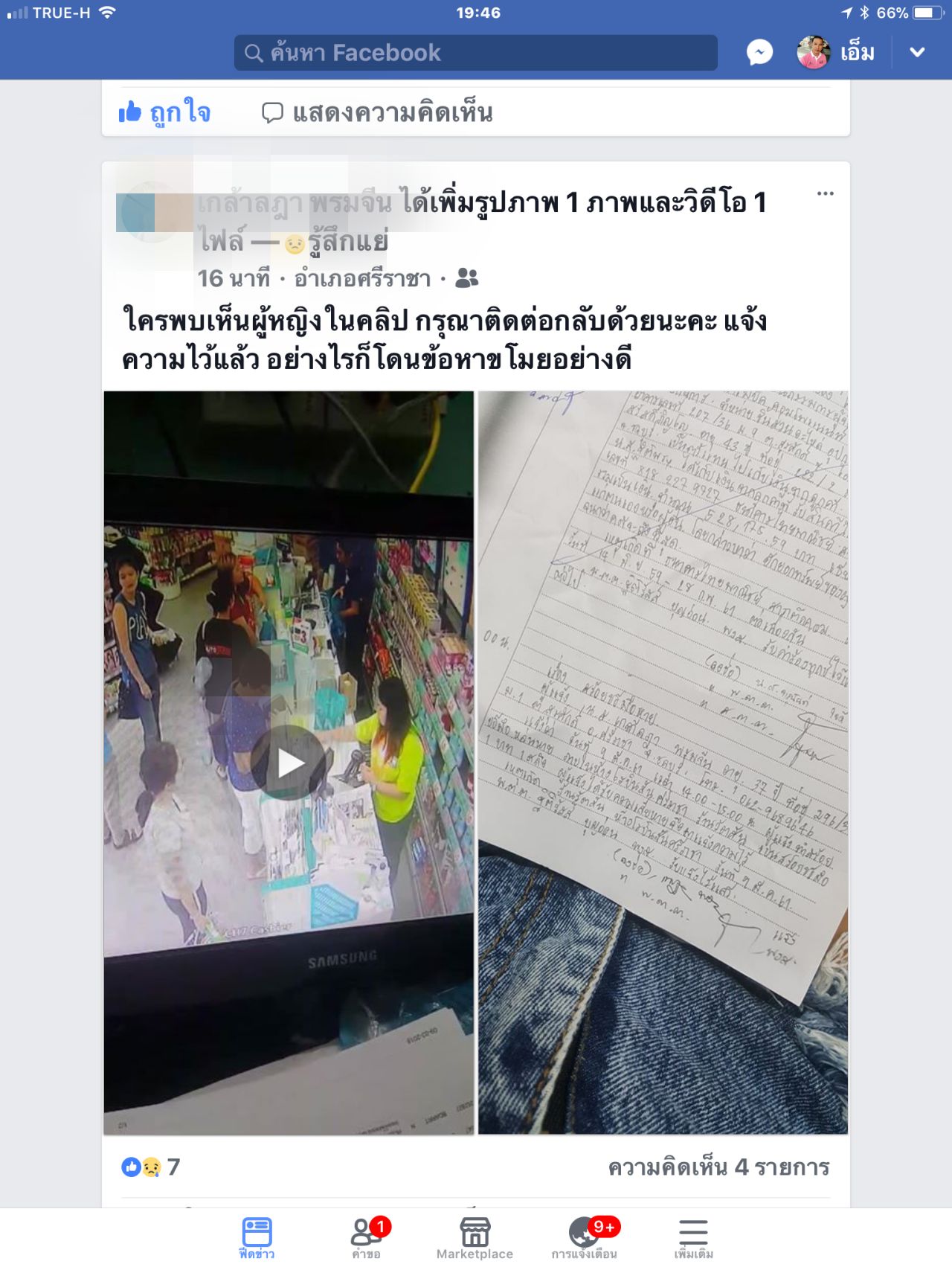 ด้าน น.ส.เกล้าฏา ผู้เสียหายได้กล่าวว่า ก่อนเกิดเหตุ ในขณะนั้นตนกำลังยืนชำระสินค้า อยู่ที่บริเวณหน้าเคาน์เตอร์ ซึ่งภายหลังจากที่ชำระสินค้าเสร็จแล้ว ตนก็ได้ทำการเปลี่ยนถุงสินค้า จากถุงเล็ก ย้ายมาใส่ถึงใหญ่ แต่ จู่ๆ สร้อยข้อมือทองคำ มีจี้เป็นรูปหัวใจ หนัก 5 สลึง ก็ได้ตกหล่นที่บริเวณหน้าเคาน์เตอร์ โดยที่ตนไม่รู้ตัว และก็ได้กลับบ้านไปพักผ่อน ต่อมาในเวลา 18.00 น. ตนตื่นขึ้นมาก็พึ่งมารู้ตัวว่า สร้อยข้อมือทองคำหาย จึงได้ออกติดตามหา จนกระทั่งมาขอตรวจสอบกล้องวงจรปิดของทางร้านดังกล่าว ก็พบว่า ในขณะที่ตนกำลังยืนชำระสินค้า ได้มีคนร้ายเป็นหญิง อายุประมาณ 50 ปี สวมเสื้อคอปกสีน้ำเงิน ลายจุดสีขาว กางเกงขายาวสีขาว รองเท้าแตะ ต่อคิวชำระสินค้าอยู่ด้านหลังตน แล้วปรากฏว่า ในขณะที่ตนชำระสินค้าเสร็จแล้วเดินออกไป คนร้ายได้ทำทีนำกระเป๋าสตางค์แบบถือวางทับสร้อยข้อมือทองคำ แล้วนำหยิบใส่กระเป๋าของตนเอง ทำเหมือนเป็นของๆตนเองก่อนหลบหนีไปอย่างลอยนวล หลังจากนั้นตนจึงได้เข้าแจ้งความร้องทุกข์ ที่ สภ.ศรีราชา เพื่อให้เจ้าหน้าที่ตำรวจช่วยติดตามตัวมนุษย์ป้าที่เก็บไปมาทำการสอบสวนอีกครั้ง