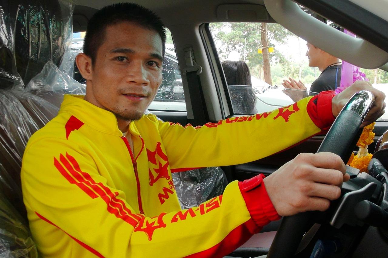 เมื่อวันที่ 31 มี.ค. 61 ที่วัดโนนฝาวพุทธาราม ต.วังตะเคียน อ.กบินทร์บุรี จ.ปราจีนบุรี เจ้าแหลม ศรีสะเกษ นครหลวงโปรโมชั่น แชมป์โลก WBC รุ่นซุปเปอร์ฟลายเวต นักชกขวัญใจชาวไทย พร้อมด้วยนายไกรพน ไกรพันธ์ ผู้อุปถัมภ์ ได้เดินทางมานมัสการหลวงปู่บุญมา โชติธัมโม พระเกจิชื่อดัง อ.กบินทร์บุรี จ.ปราจีนบุรี มาพร้อมกับรถยนต์โตโยต้า ฟอร์จูนเนอร์ คู่ใจ สีขาว ยังไม่ติดแผ่นป้ายทะเบียน ของขวัญที่บริษัทโตโยต้ามอบให้