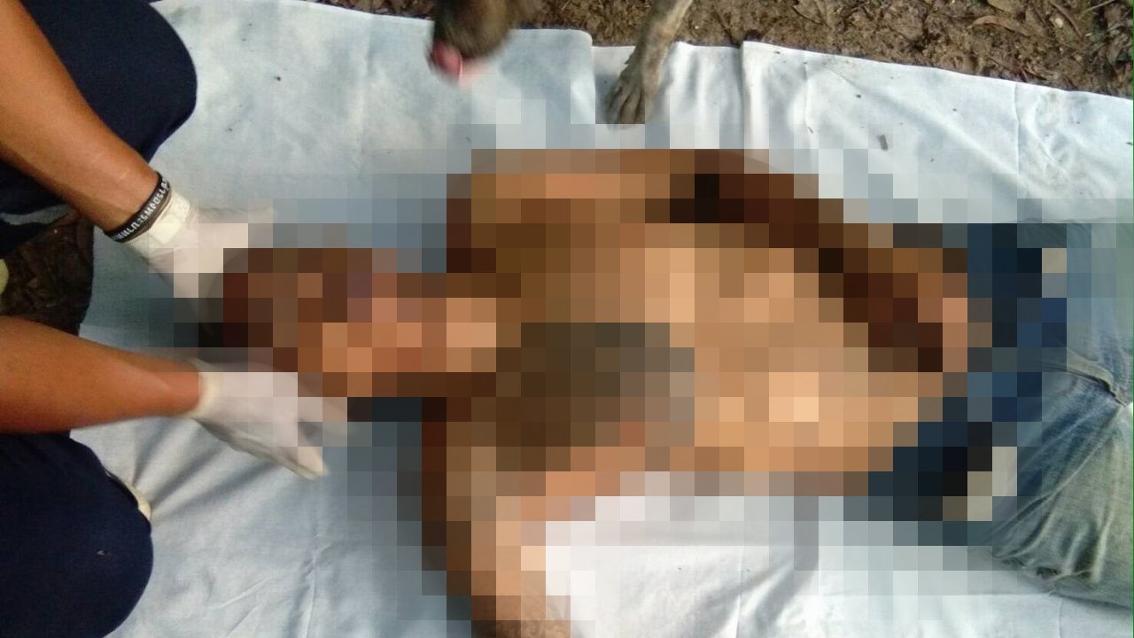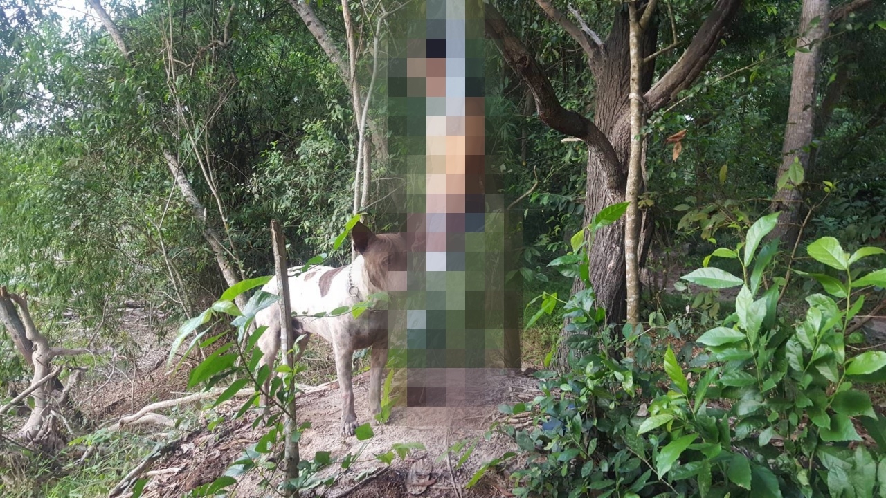 ที่เกิดเหตุ พบชายไทยไม่ทราบชื่อ อายุประมาณ 30 ปี สูง 170 เซนติเมตร มีรอยสักทั้งตัว ข้อมือซ้ายสักรูปโดราเอมอน สวมกางเกงยีนส์ขายาว ถอดเสื้อเชิ้ตลายสก๊อตใช้ผูกคอตัวเองกับต้นไม้ โดยมีสุนัขพันธุ์ไทย อายุประมาณ 7-8 ปี นั่งเฝ้าศพเจ้าของอยู่ไม่ห่าง โดยเจ้าหน้าที่ได้นำร่างผู้เสียชีวิตลงมา เพื่อทำการตรวจสอบ ซึ่งคาดว่าเสียชีวิตมาแล้วไม่ต่ำกว่า 8 ชั่วโมง และไม่พบร่องรอยของการถูกทำร้ายแต่อย่างไร เจ้าหน้าที่ตำรวจจึงได้บันทึกภาพผู้เสียชีวิต และสถานที่เกิดเหตุ ไว้เป็นหลักฐาน