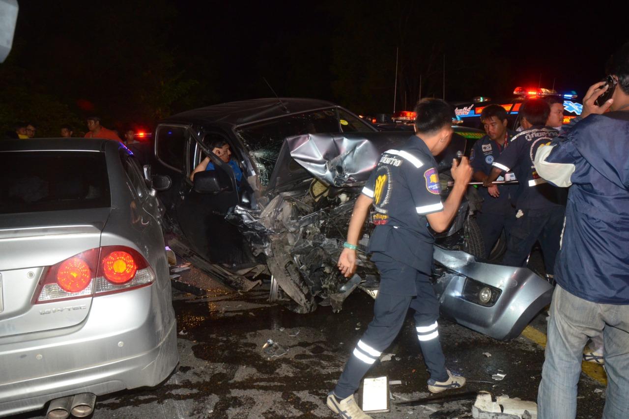 ส่วนบริเวณกลางถนน พบรถกระบะ อีซูซุ สีเทา ทะเบียน กธ 3701 พระนครศรีอยุธยา สภาพด้านหน้าฝั่งคนขับพังยุบ มีผู้ติดอยู่ภายในที่นั่งคนขับ คือ นายประยุทธ์ ไตรพา อายุ 30 ปี ชาวบ้าน หมู่ที่ 8 ตำบลบางไทร อำเภอบางไทร จังหวัดพระนครศรีอยุธยา ทางหน่วยกู้ภัยได้นำร่างผู้บาดเจ็บออกมาจากตัวรถ พร้อมนำผู้บาดเจ็บทั้ง 2 ราย ส่งโรงพยาบาลเจ้าพระยาอภัยภูเบศร เพื่อให้แพทย์รักษาพยาบาลเป็นการด่วน