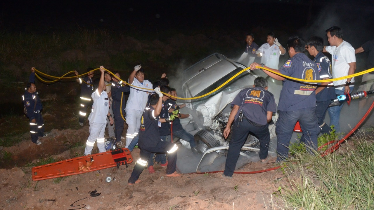 หน่วยกู้ภัยต้องเร่งช่วยนำเครื่องมือตัดถ่ายมางัดร่างของ ผอ.โรงเรียนวัดลำดวน หลังเกิดอุบัติเหตุรถชนกัน 3 คันรวดบนถนนสุวินทวงศ์ ใกล้สถานีขนส่งปราจีนบุรี โดยคู่กรณีมีเจ็บ 2 ราย...