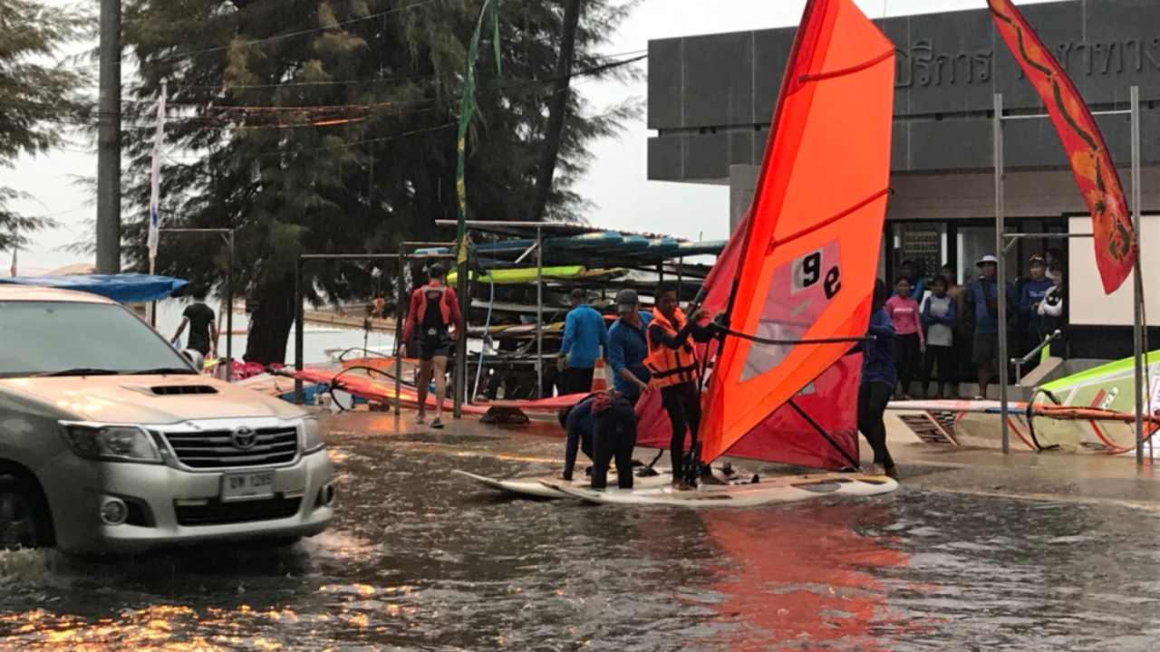 ขณะที่ นักกีฬาทีมชาติสมาคมวินด์เซิร์ฟแห่งประเทศไทย ซึ่งมีที่ตั้งอยู่ริมชายหาดจอมเทียน ต่างเร่งกันออกมานำกระดานโต้คลื่นและใบเรือแล่นบนผิวถนน เพื่อขนย้ายออกจากพื้นที่จัดเก็บ เป็นการป้องกันความเสียหายจากมวลน้ำที่ไหลบ่าลงสู่ทะเลอย่างรุนแรง สร้างความแปลกตาต่อผู้พบเห็น และภาพลักษณ์ด้านลบต่อการท่องเที่ยวอย่างยิ่ง ส่วนเจ้าหน้าที่ตำรวจและหน่วยงานที่เกี่ยวข้อง ต่างระดมกำลังออกมาช่วยเหลือ และอำนวยความสะดวกแก่ประชาชนและนักท่องเที่ยวตามท้องถนน ท่ามกลางพายุที่ตกลงมาอย่างต่อเนื่อง
