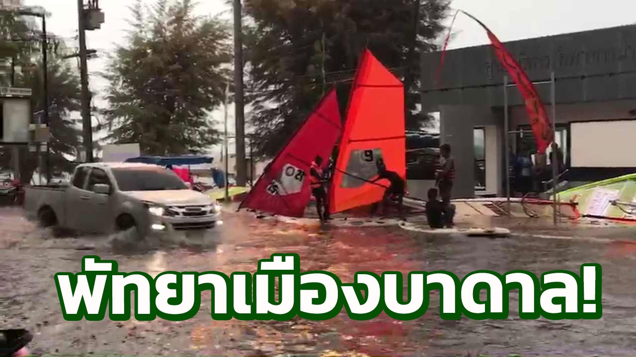 พายุฝนกระหน่ำ ทำพัทยาจมบาดาล มวลน้ำไหลบ่าถนนชายหาดจอมเทียน การจราจรเป็นอัมพาต การท่องเที่ยวยับเยิน พร้อมมีภาพนักกีฬานำกระดานโต้คลื่นออกมากางใบริมถนน