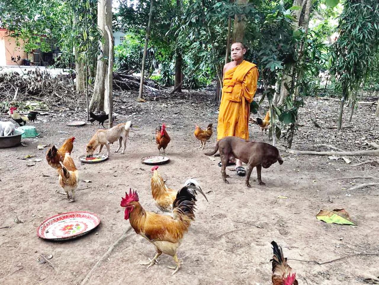 เมื่อเห็นดังนั้น ก็ไม่รู้จะทำอย่างไร ก็ได้แต่รับเลี้ยงไว้ ซึ่งไก่ทั้งหมดนั้น เป็นไก่ไข่ตัวผู้ ซึ่งเคยอยู่แต่ในกรง ทำให้ไม่สามารถหาอาหารกินเองได้ พระในวัด ก็พยายามเอาอาหารไปฝังไว้ในดิน เพื่อหัดให้ไก่ได้หากินเอง และออกกำลังกายบ้าง โดยพระในวัดช่วยกันเลี้ยงไว้ รวมกับสุนัข และหมู ซึ่งก็อยู่ร่วมกันได้.