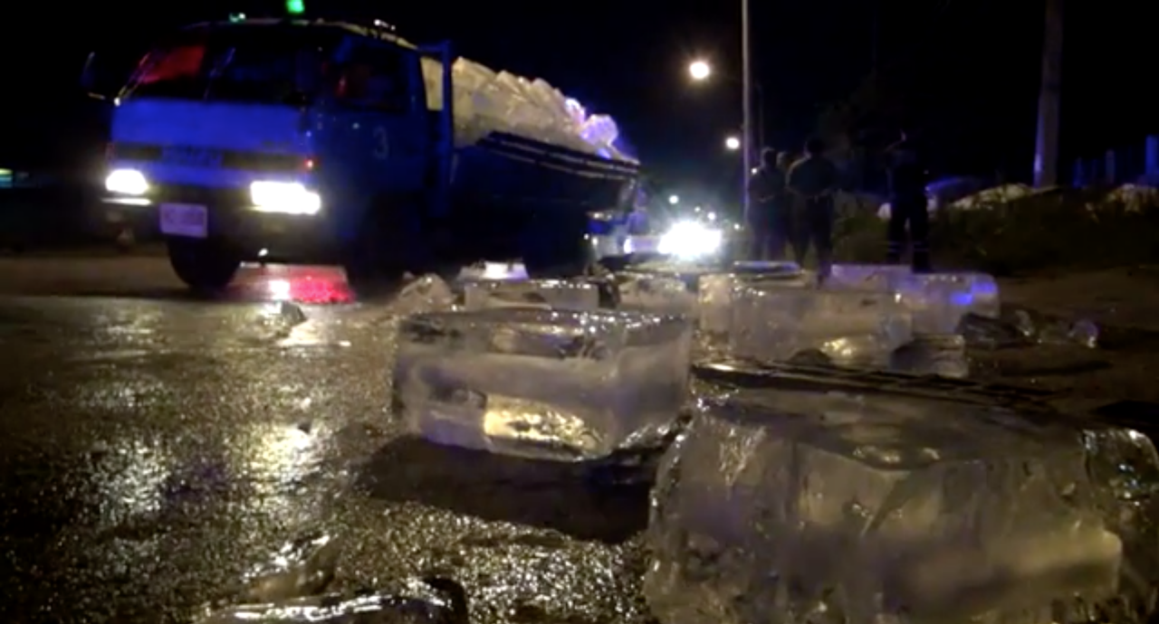 ใกล้กันพบรถ 6 ล้อยี่ห้ออีซูซุ สีน้ำเงิน บรรทุกน้ำแข็งของบริษัท ทำน้ำแข็งชลบุรี จำกัด ทะเบียน 82 – 2009 ชลบุรี สภาพด้านท้ายรถพัง ก้อนน้ำแข็งขนาดใหญ่ตกกระจายเกลื่อน