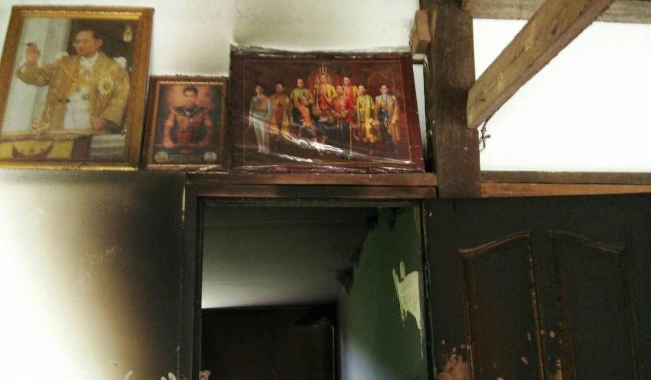 เมื่อไปถึง นายอำนาจ สังฆธรรม พร้อมภรรยา ได้พาไปตรวจบริเวณชั้นสองของบ้าน พบที่นอน หมอน เครื่องรับโทรทัศน์ มีร่องรอยถูกไฟเผาไหม้เสียหายใช้งานไม่ได้ รวมทั้งพื้นกระดาน ผนังบ้านและประตู ถูกเปลวไฟไหม้เป็นสีดำเสียหายเช่นกัน แต่ที่น่าอัศจรรย์พบว่าพระบรมฉายาลักษณ์พระบาทสมเด็จพระปรมินทรมหาภูมิพลอดุลยเดช บรมนาถบพิตร รัชกาลที่ 9 และราชวงศ์จักรี กับพระบรมฉายาลักษณ์สมเด้จพระเจ้าตากสิน ที่แขวนเรียงกันไว้บนประตูทางเข้าห้องนอนกลับไม่ถูกไฟไหม้แต่อย่างใด เป็นที่น่าแปลกใจกับผู้พบเห็นอย่างมาก