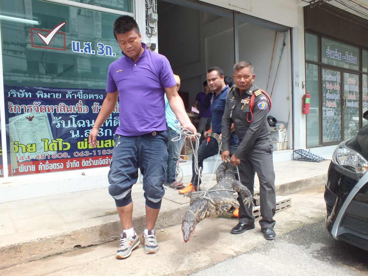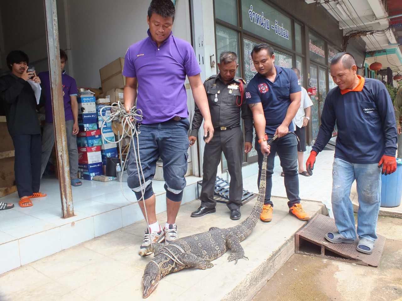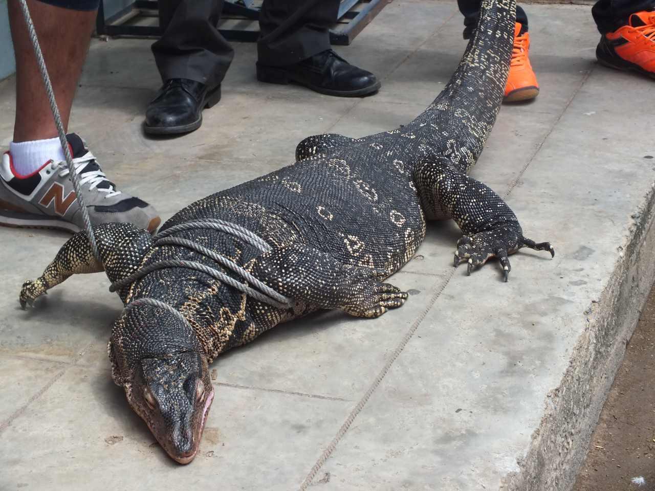 ที่บ้านดังกล่าวพบตัวเงินตัวทองตัวขนาดใหญ่ ลำตัวสีดำ มีลายดอกสีเหลืองชัดเจนทั่วตัว กำลังเดินส่ายอาดๆ ไปมาอยู่ภายในบ้าน จึงช่วยกันจับ แต่เป็นไปอย่างทุลักทุเล เนื่องจากมันใช้หางสะบัด ปากก็พร้อมจะกัดต่อสู้กับคน ใช้เวลาประมาณ 10 นาทีจึงจับตัวมัดได้สำเร็จ เป็นตัวเงินตัวทองขนาดใหญ่ หนักประมาณ 60 กิโลกรัม ความยาวร่วม 3 เมตร นำไปปล่อยคืนสู่ธรรมชาติต่อไป