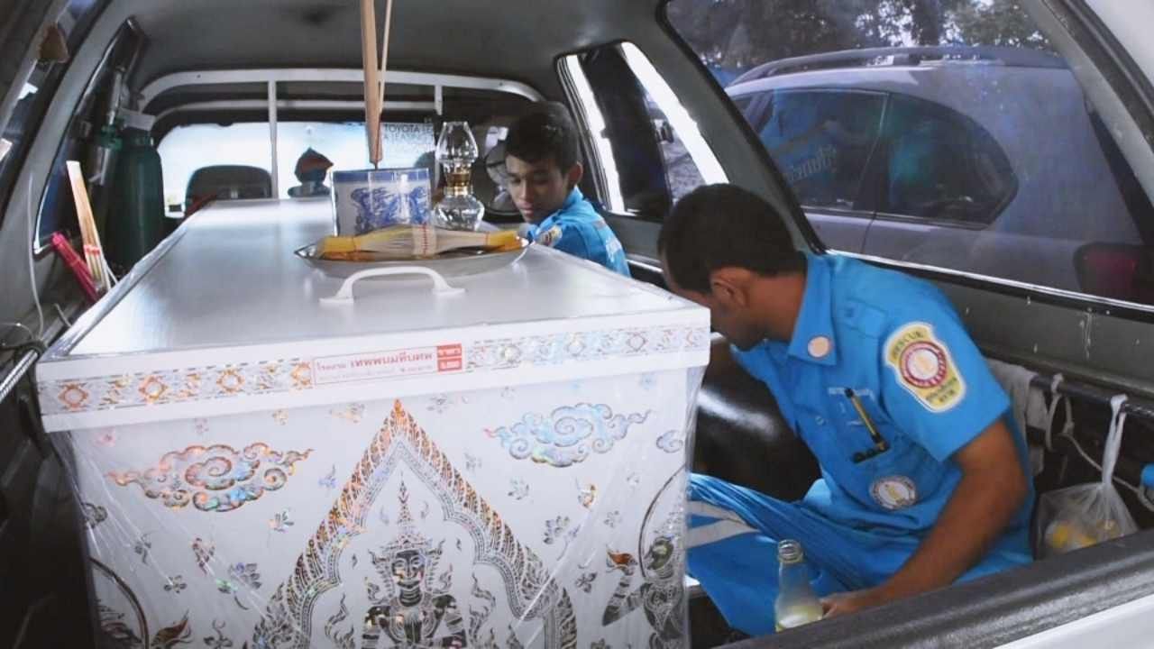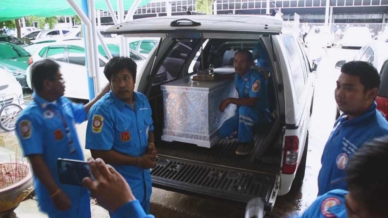 จากนั้นเดินทางด้วยรถกู้ภัยสมาคมตราดพุทธสงเคราะห์ นำร่างไร้วิญญาณกลับไปบำเพ็ญกุศลที่บ้านเกิดใน อ.คลองใหญ่ จ.ตราด โดยที่ผู้เป็นยายไม่ได้เดินทางมาร่วมรับศพด้วย เนื่องจากติดการดูแลจัดเตรียมสถานที่จัดงานศพ โดมีเจ้าหน้าที่ประจำห้องเก็บศพมาคอยดูแลอำนวยความสะดวก จนถึงขั้นตอนการส่งมอบศพให้กับทางญาตินำขึ้นรถกู้ภัยฯ ท่ามกลางบรรยากาศที่เต็มไปด้วยความโศกเศร้าอาลัย