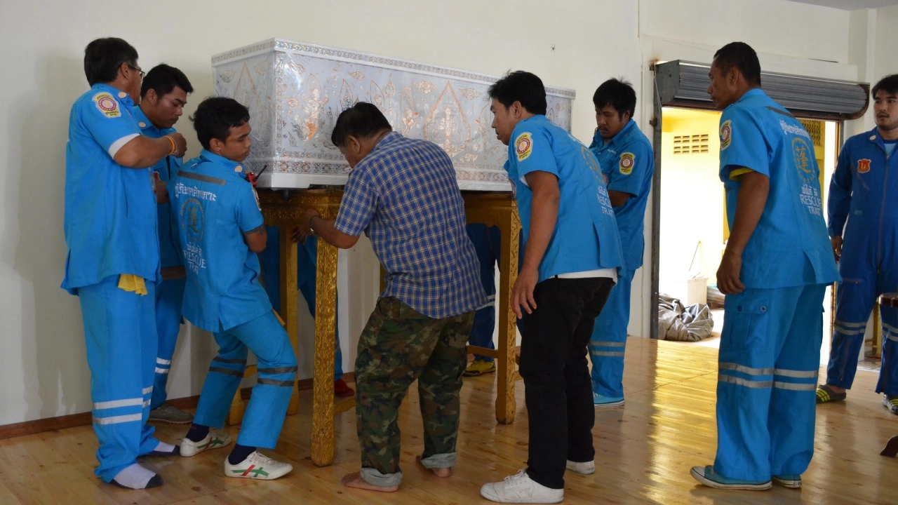 ทันทีที่ศพน้องกิ๊ฟมาถึง เจ้าหน้าที่กู้ภัยก็ได้ช่วยกันเคลื่อนย้ายเข้าไปยังศาลาที่จัดสถานที่เตรียมไว้ จากนั้นญาติๆ และชาวบ้านที่อยู่บริเวณใกล้เคียงก็มาช่วยกันจัดเตรียมสถานที่เพื่อเตรียมประกอบพิธีตามศาสนา