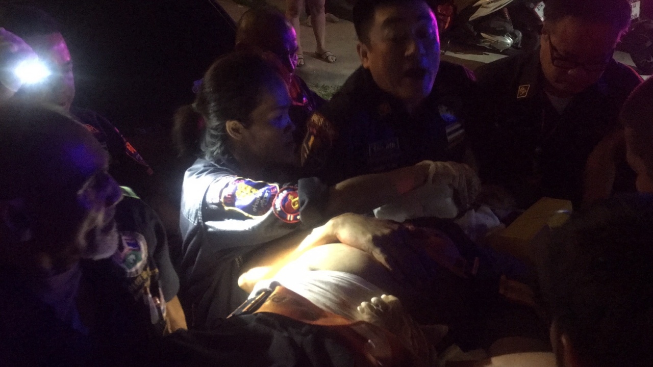 ที่เกิดเหตุพบเจ้าหน้าที่หน่วยกู้ภัยกำลังช่วยกันปฐมพยาบาล นายศรีวิกรณ์ จันทร์งิ้ว อายุ 26 ปี ชาวอ.สวรรคโลก จ.สุโขทัย ได้รับบาดเจ็บจากของมีคมกระหน่ำแทงเข้าที่บริเวณคอข้างซ้าย จำนวน 1 แผล และชายโครงข้างซ้าย จำนวน 3 แผล เจ้าหน้าที่จึงได้ปฐมพยาบาลเบื้องต้น ก่อนนำตัวส่งโรงพยาบาลสมเด็จพระบรมราชเทวี ณ ศรีราชา เพื่อให้แพทย์ทำการช่วยเหลืออย่างเร่งด่วน