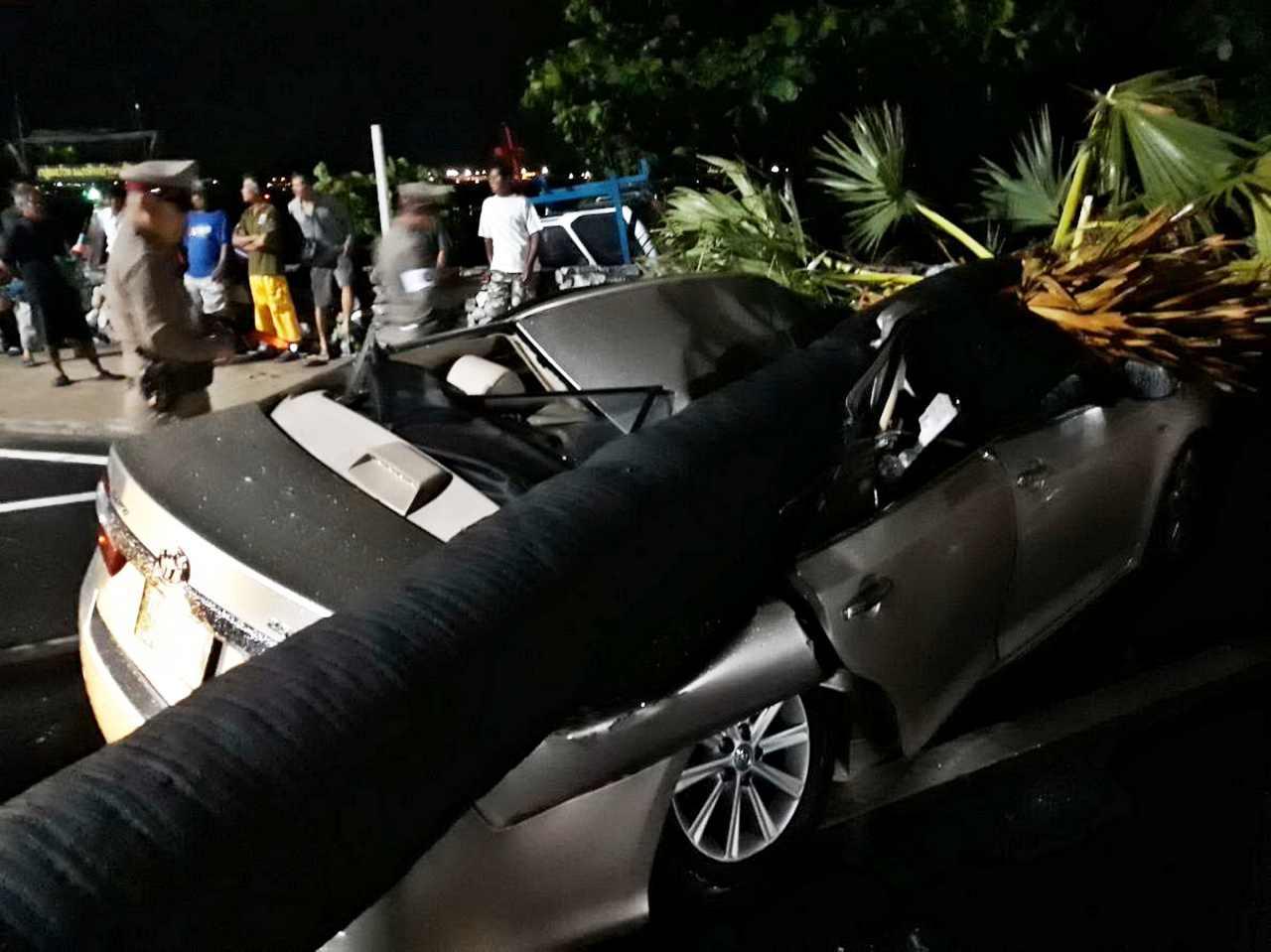 ที่เกิดเหตุพบต้นตาลขนาดใหญ่ ความสูงประมาณ 15-20 เมตร ล้มทับหลังคารถเก๋ง โตโยต้า คัมรี สีบรอนซ์ ป้ายทะเบียนสีเขียว ณข 2223 กรุงเทพมหานคร ในสภาพรถพังเสียหายทั้งคัน ตรวจสอบภายในรถไม่มีคนขับและผู้โดยสาร โดยมีนายสิโรตม์ พึ่งฉ่ำ อายุ 57 ปี พักบ้านเลขที่ 150/6 ซ.สะพานขวา แขวงและเขตบางซื่อ กทม. แสดงตัวเป็นเจ้าของรถ ทั้งนี้ เจ้าหน้าที่ได้ปิดการสัญจรบริเวณดังกล่าวเนื่องจากต้นตาลมีความยาวจนขวางถนน รอเจ้าหน้าที่เทศบาลเมืองสัตหีบนำรถยกมายกต้นตาลออก