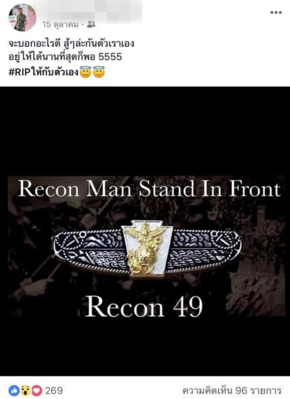อย่างไรก็ดี เฟซบุ๊กของ เกรียงศักดิ์ เพ่งพินิจ นักเรียนรีคอนผู้เสียชีวิต ได้โพสต์เอาไว้ก่อนเข้ารับการศึกษาหลักสูตรดังกล่าวว่า “จะบอกอะไรดี สู้ๆล่ะกันตัวเราเอง อยู่ให้ได้นานที่สุดก็พอ #RIPให้กับตัวเอง” พร้อมโพสต์ภาพเครื่องหมายรีคอนที่มีข้อความประกอบว่า “Recon Man Stand In Front Recon 49”