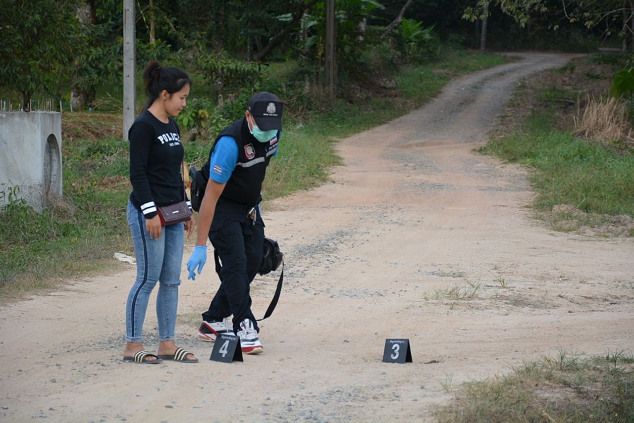 ต่อมาเมื่อเวลา 17.30 น. ผู้สื่อข่าว ได้ลงพื้นที่ตรวจสอบข้อเท็จจริงจนทราบว่า เหตุการณ์ดังกล่าวเกิดขึ้นเมื่อวันที่ 19 ธ.ค.ที่ผ่านมา ในพื้นที่ ต.อ่างคีรี อ.มะขาม จ.จันทบุรี ส่วนบุคคลภายในคลิป เป็นตำรวจสังกัด สภ.มะขาม โดย พ.ต.อ.เชษฐา กีชวรรณ ผกก.สภ.มะขาม พร้อมด้วย ร.ต.อ.คมกฤช สมจิตร รอง สว.(สอบสวน) พร้อมเจ้าหน้าที่ กองพิสูจน์หลักฐาน ลงพื้นที่ตรวจสอบที่เกิดเหตุ ภายในสวนบริษัทบ้านอ่าง ม.2 ต.อ่างคีรี อ.มะขาม จ.จันทบุรี เพื่อตำรวจสอบหาปลอกกระสุน โดยใช้เครื่องตรวจจับโลหะ พร้อมทั้งตรวจสอบทิศทางระยะ ตลอดจนวิถีการยิงแต่ละนัด เพื่อบันทึกไว้เป็นข้อมูล ในการรวบรวมหลักฐาน พร้อมทั้ง สอบปากคำพยานแวดล้อมที่อยู่ในเหตุการณ์ โดยเฉพาะ น.ส.บี อายุ 21 ปี อยู่บ้านเลขที่ 117 ม.14 ต.โคกกรวด อ.เมือง จ.นครราชสีมา ซึ่งเป็นคนงานกรีดยาง และเป็นผู้ถ่ายคลิปเหตุการณ์ ได้พาเจ้าหน้าที่ไปชี้จุด ที่ตำรวจคนดังกล่าวก่อเหตุยิงสุนัข ซึ่งเห็นว่าการกระทำดังกล่าว เป็นการกระทำที่เกินกว่าเหตุ จึงนำคลิปมาโพสต์ พร้อมกับขอความช่วยเหลือจาก องค์กรWATCHDOGTHAILAND ให้เข้ามาช่วยตรวจสอบ จากนั้นจึงได้เดินทางไปแจ้งความบันทึกไว้เป็นหลักฐานที่ สภ.มะขาม