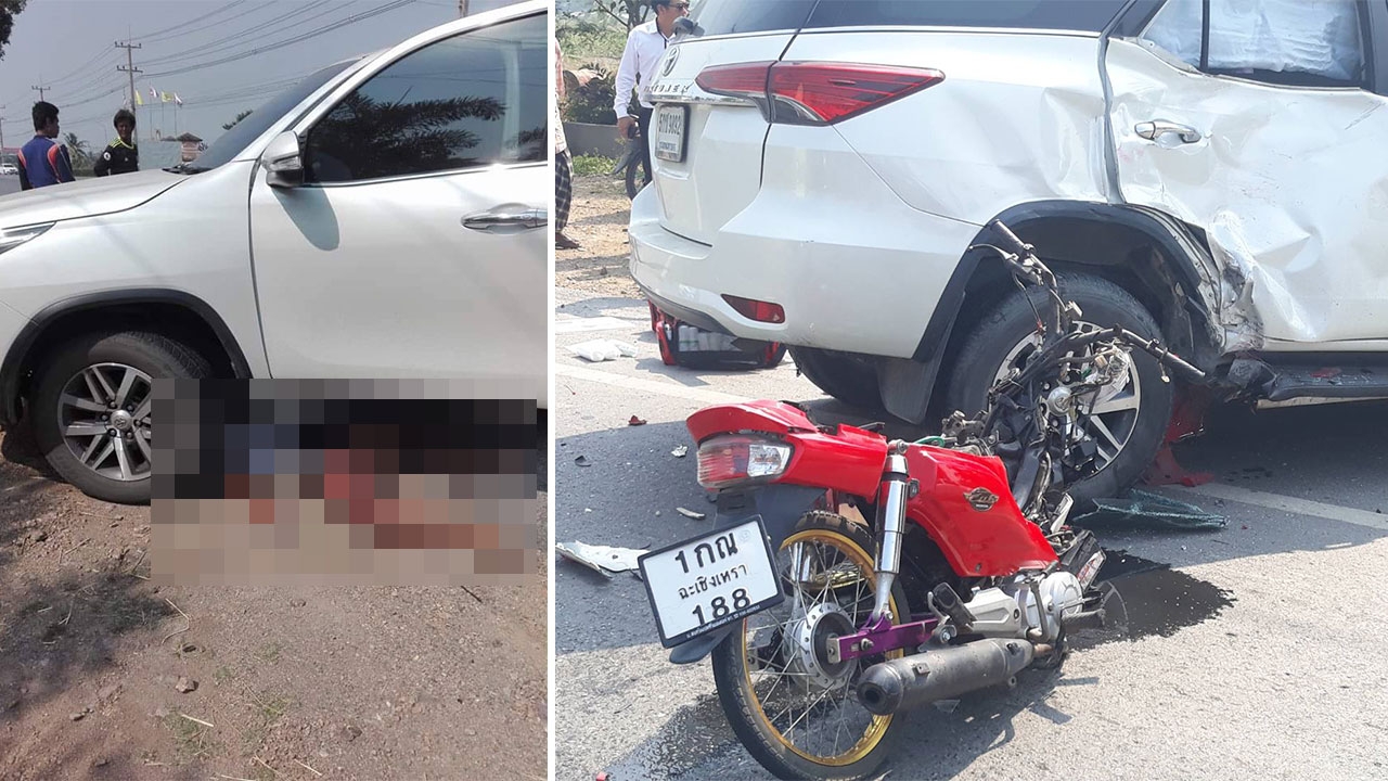 สลด! ฟอร์จูนเนอร์ชะลอเลี้ยว ถูก จยย.ตามหลังพุ่งชนอย่างจัง ทำหนุ่ม 16 คนขับ จยย.กระเด็นอยู่ใต้ท้องฟอร์จูนเนอร์ บาดเจ็บสาหัส ก่อนเสียชีวิตในเวลาต่อมาที่ รพ.