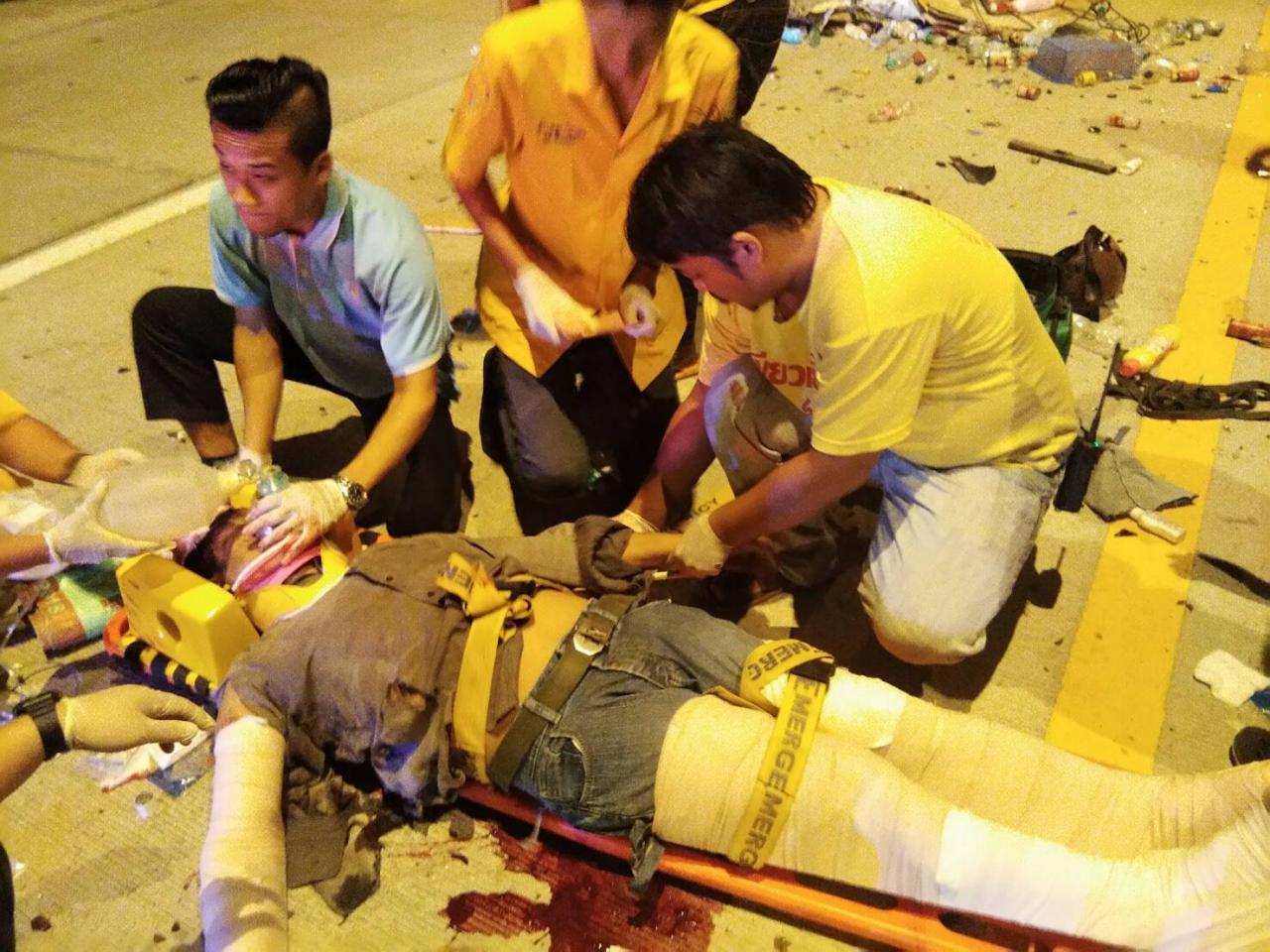ที่เกิดเหตุเป็นถนน 4 เลน ขับขี่ทางเดียว ที่เลนขวาสุดพบผู้ได้รับบาดเจ็บนอนหมดสติอยู่ทราบชื่อคือนายฮิม ทวีพรสกุล อายุ 35 ปี อยู่บ้านเลขที่ 281/35 ม.4 ต.ท่าขนุน อ.ทองผาภูมิ จ.กาญจนบุรี ได้รับบาดเจ็บเป็นแผลฉกรรจ์ขนาดใหญ่ที่บริเวณศีรษะ แขน ขา ข้างขวาหัก และถลอกตามร่างกาย อาการสาหัสเป็นตายเท่ากัน เจ้าหน้าที่จึงได้รีบปฐมพยาบาลเบื้องต้น ก่อนนำตัวส่งโรงพยาบาลสมเด็จพระบรมราชเทวี ณ ศรีราชา ในขณะเดียวกันเจ้าหน้าที่พบรถจักรยานยนต์พ่วงข้าง ยี่ห้อ ฮอนด้า เวฟ สีดำ หมายเลขทะเบียน คษพ 852 ชลบุรี อยู่ในสภาพพลิกคว่ำล้อชี้ฟ้า รอบๆรถพบขวดพลาสติกจำนวนหลายขวดตกกระจายเต็มพื้นถนน ไม่ห่างกันพบรถยนต์ตู้ ยี่ห้อ โตโยต้า สีขาว หมายเลขทะเบียน ฮภ 2916 กรุงเทพมหานคร สภาพด้านหน้ารถพังเสียหาย ซึ่งมี นางภูริตา ดรีมธุรกุล อายุ 41 ปี ผู้ขับขี่ ยืนรอให้การอยู่ในที่เกิดเหตุ ห่างออกไปประมาณ 100 เมตร พบรถยนต์กระบะ ยี่ห้อ โตโยต้า สีบรอน์เงิน หมายเลขทะเบียน ผม 9334 ชลบุรี สภาพด้านหน้าฝั่งขวามีร่อยรอยเฉี่ยวชน โดยมีนายประเวท โคตบับพา อายุ 40 ปี ผู้ขับขี่ ได้รับบาดเจ็บจากการกระแทก เจ้าหน้าที่จึงได้ปฐมพยาบาลเบื้องต้น