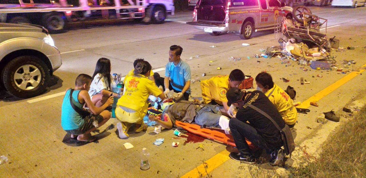 หนุ่มขับซาเล้งเก็บขวดขาย ซิ่งเลนขวาถูกกระบะเฉี่ยวชน จนพลิกคว่ำ ก่อนถูกรถตู้ตามหลังชนซ้ำอาการสาหัส เป็นตายเท่ากัน...