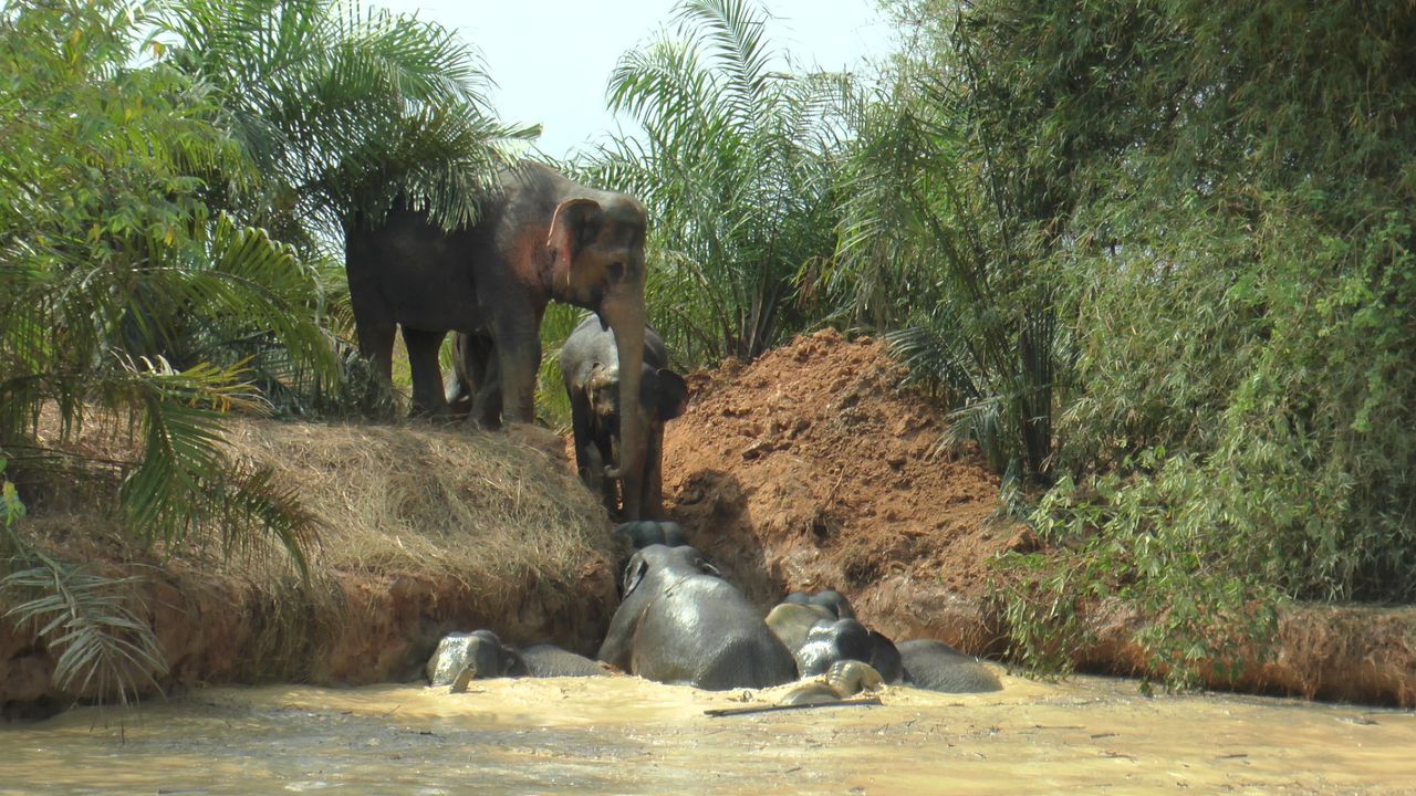 ช้างป่าเขาอ่างฤาไน ยกทัพออกหากินป่า ต.ท่าตะเกียบ ฉะเชิงเทรา ก่อนลงไปในสระน้ำสวนปาล์มชาวบ้าน แล้วไม่สามารถขึ้นมาได้ ทั้ง 13 ตัวพยายามตะเกียกตะกายหาทางขึ้น กระทั่ง นอภ.ท่าตะเกียบสั่งนำรถแบ็กโฮ มาขุดขอบสระน้ำเพื่อเปิดทางให้ขึ้นกว่า 5 ชม.จึงสำเร็จท่ามกลางความดีใจของชาวบ้าน ขณะที่เจ้าของสวนไร่นา วอนรัฐบาลเร่งแก้ปัญหาที่ช้างป่ากว่า 300 ตัวออกมาหากิน...