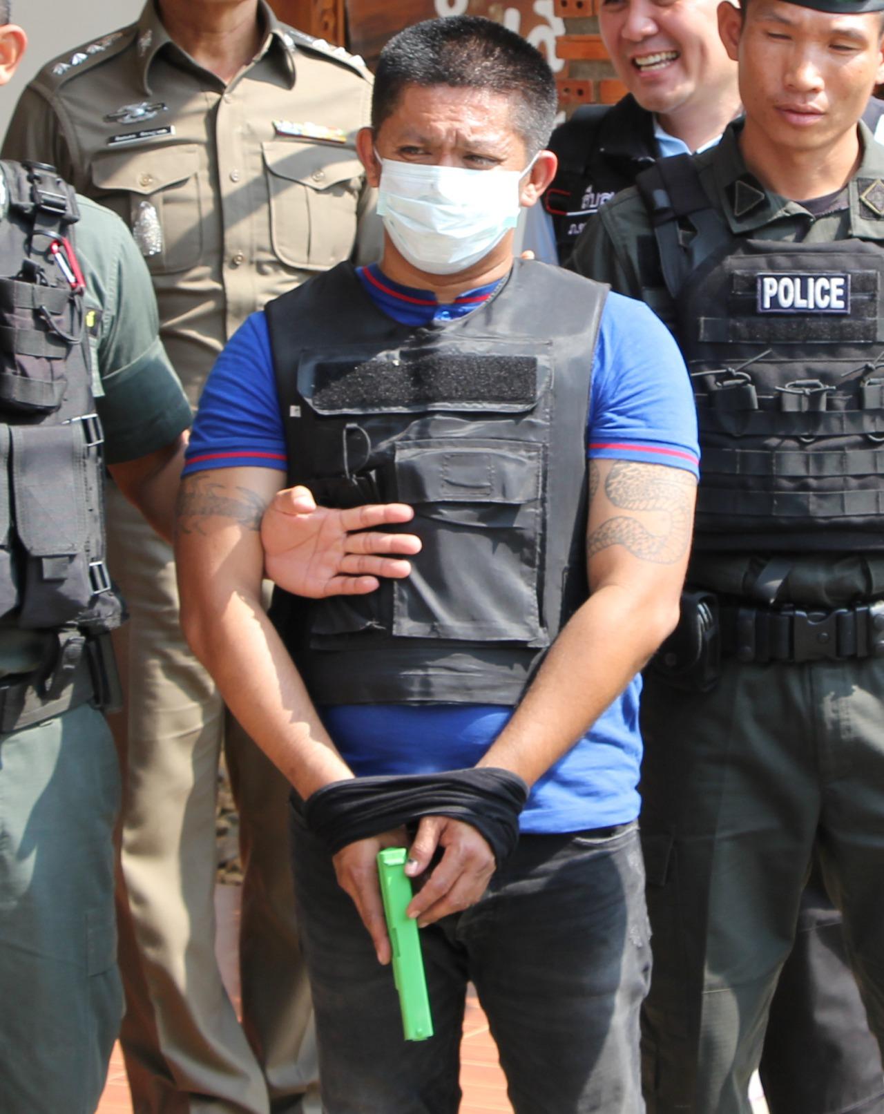 ต่อมาทางเจ้าหน้าที่ตำรวจต่างเร่งล่าตัวจนรวบตัว “ปุ๊-ธีรพล ปิ่นอมร” ผู้ต้องหาฆ่าโหดยกครัว 5 ศพได้แล้ว โดยจับได้ที่รอยต่อจังหวัดชุมพร-ระนอง ขณะกำลังจะข้ามไปประเทศเมียนมา บริเวณหมู่ 6 ตำบลลำเลียง อำเภอกระบุรี จังหวัดระนอง โดยมีการว่าจ้างวัยรุ่นในพื้นที่ให้ช่วยพาหลบหนี จึงสั่งการให้ประสานกับกำลังเจ้าหน้าที่ในพื้นที่นำกำลังเข้าจับกุม จากนั้นควบคุมตัวมาที่กองร้อยทหารราบที่ 2521 โดยจากการตรวจสอบของเจ้าหน้าที่ตำรวจพบว่า ผู้ต้องหามีหมายเรียกคดีฉ้อโกงเงินบาทหลวงไชโย กิจสกุล อายุ 66 ปี อธิการสามเณราลัยนักบุญยอแซฟ ที่รู้จักและคบหากันมานาน ในพื้นที่ สภ.ศรีราชา อ.ศรีราชา จ.ชลบุรี