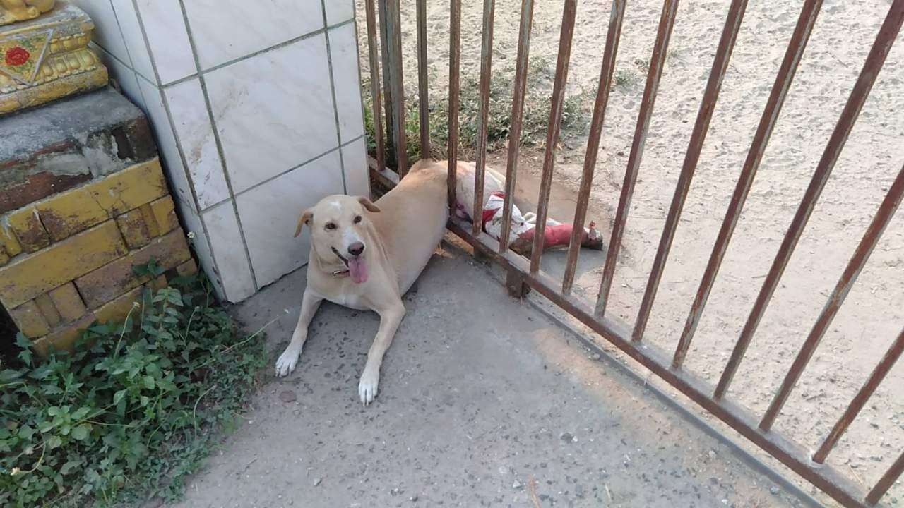จากการสอบถามนางนิต ได้เล่าว่า เมื่อช่วงเช้ามืดจนได้ตื่นขึ้นมาใส่บาตรพระตามปกติ โดยปกติแล้วสุนัขตัวนี้จะวิ่งออกมาหาตนอยู่เป็นประจำทุกๆ เช้าแต่มาวันนี้มันผิดปกติว่าทำไมสุนัขของตนไม่วิ่งออกมารับตน ตนจึงเดินหาไปรอบๆ บ้านก็มาพบว่า สุนัขของตนนั้นติดคาประตูรั้วบ้านอยู่ จึงรีบโทรแจ้งเจ้าหน้าที่หน่วยกู้ภัยให้รีบเดินทางเข้ามาช่วยเหลือสุนัขของตน.