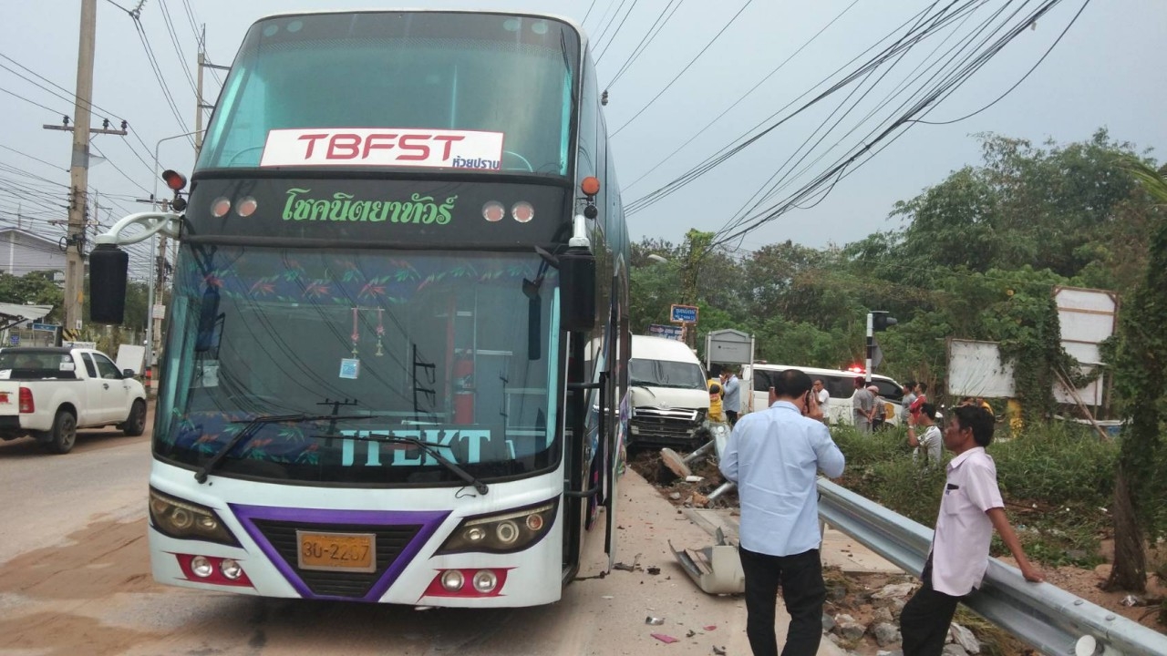หนุ่มโรงงานที่ศรีราชาดวงซวย ยืนรอรถมารับไปทำงานริมถนนสุขาภิบาล 8 ฝั่งขาเข้าบริเวณโค้งยายแป้น เจอรถบัสเบรกแตกพุ่งชนรถตู้ ไหลมาทับร่างตายคาที่ ส่วนคนในรถตู้บาดเจ็บหลายราย...