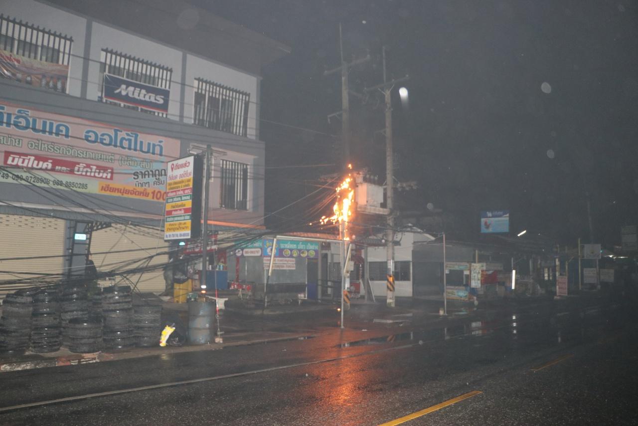 จุดเกิดเหตุนั้นมีไฟไหม้บนเสาไฟฟ้าจำนวน 2 ต้น โดยบริเวณหน้าร้านเจ้ทรายบะหมี่เป็ดย่าง โดยไฟลุกไหม้สายไฟ สายเคเบิ้ล สายสื่อสาร รวมทั้งไหม้หม้อแปลงไฟฟ้าด้วย เจ้าหน้าที่ต้องใช้ถังดับเพลิงฉีดควบคุมเนื่องจากยังไม่มีการตัดกระแสไฟฟ้า หากใช้น้ำก็จะทำให้ไฟฟ้าช็อตคนเป็นอันตรายได้