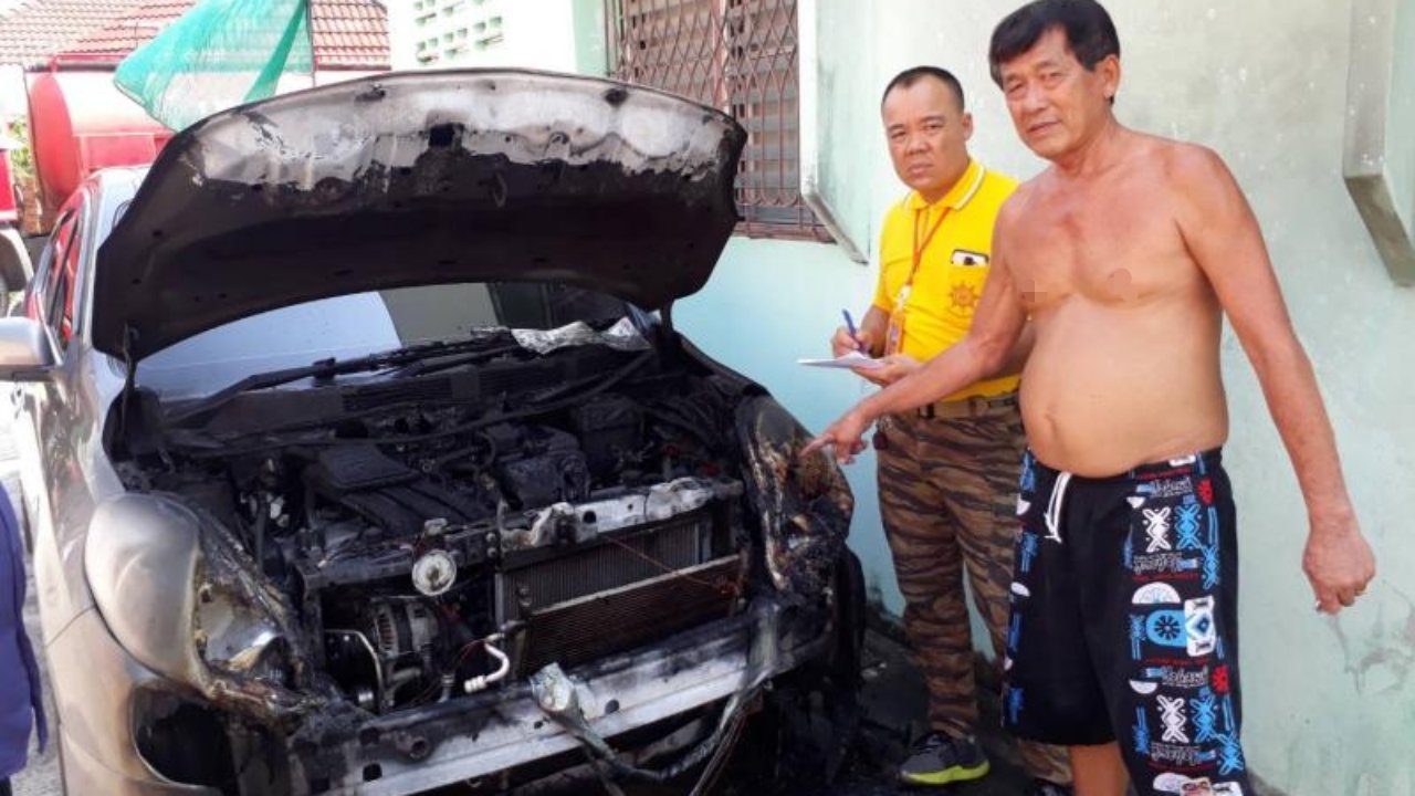 ที่เกิดเหตุพบชาวบ้านช่วยกันนำน้ำมาดับไฟที่ลุกรถยนต์เก๋งยี่ห้อนิสสันรุ่น อัลเมร่าสีน้ำตาล หมายเลขทะเบียน กร - 6239 ระยอง ที่จอดอยู่ข้างบ้านพัก ใช้เวลาประมาณ 10 นาทีไฟดับลงแต่ยังมีกลุ่มควันอยู่ เสียหายบริเวณด้านหน้ารถยนต์เก๋ง แต่โชคดีที่ไม่ไหม้หมดทั้งคัน