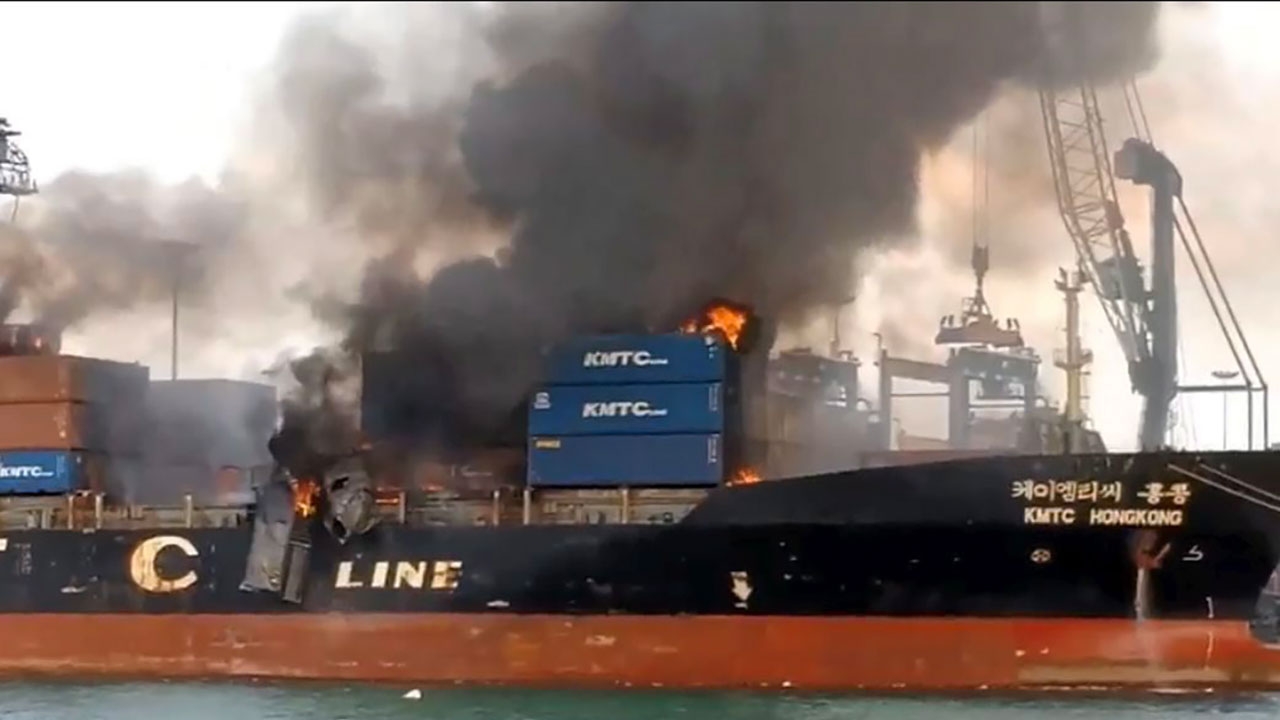 ควันไฟดำทะมึนพวยพุ่งขึ้นจากเรือบรรทุกสินค้า KMTC Hongkong ขณะจอดท่าเทียบเรือ A 2 ท่าเรือแหลมฉบัง ต.ทุ่งสุขลา อ.ศรีราชา จ.ชลบุรี หลังมีเพลิงไหม้ตู้คอนเทนเนอร์ที่ขนมาทำให้สารเคมีฟุ้งกระจายไปชุมชนใกล้เคียง.